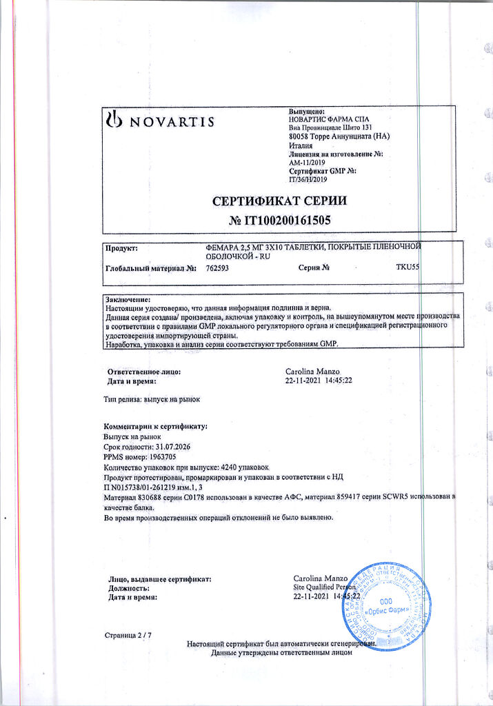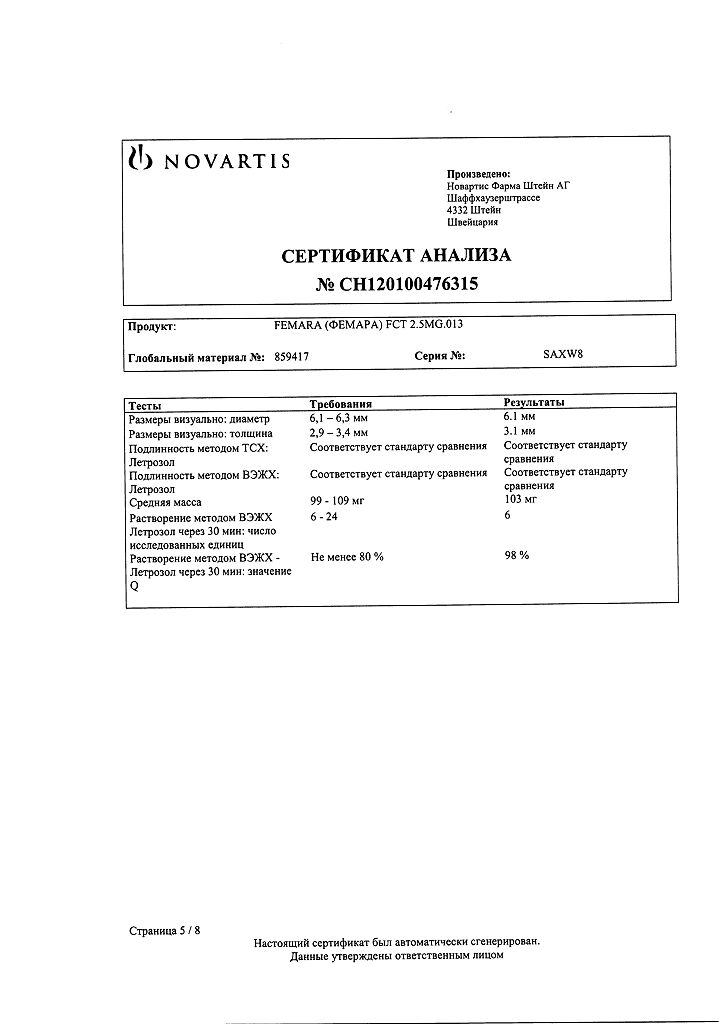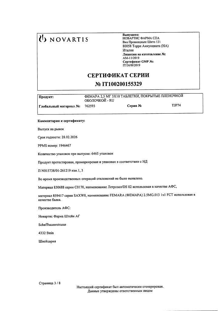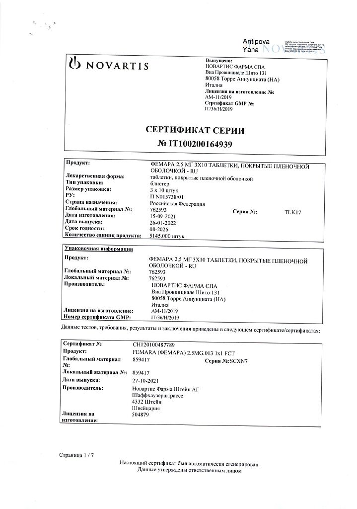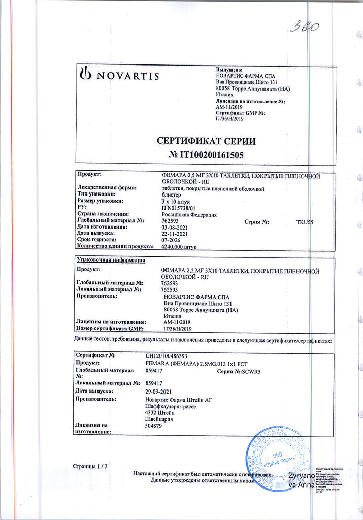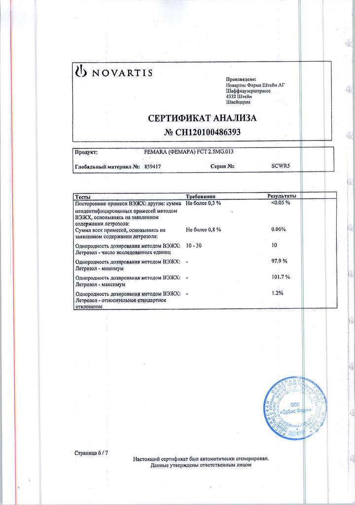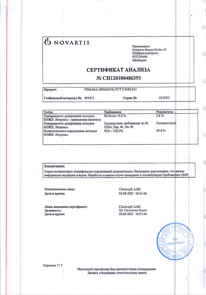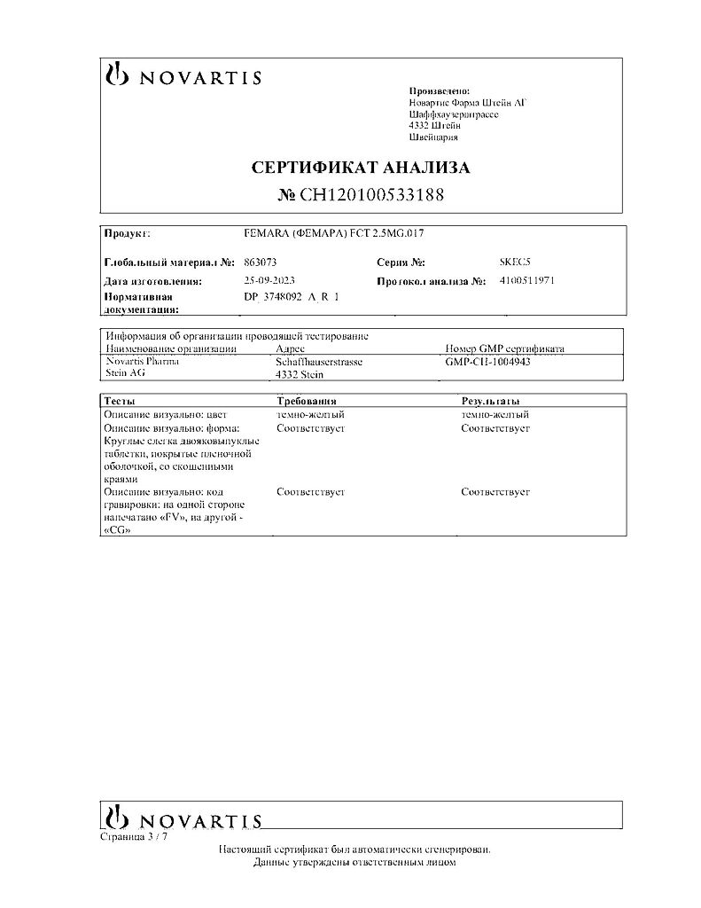 Для взрослых рекомендуемая доза препарата Фемара® составляет 2,5 мг 1 раз/сутки, ежедневно длительно.