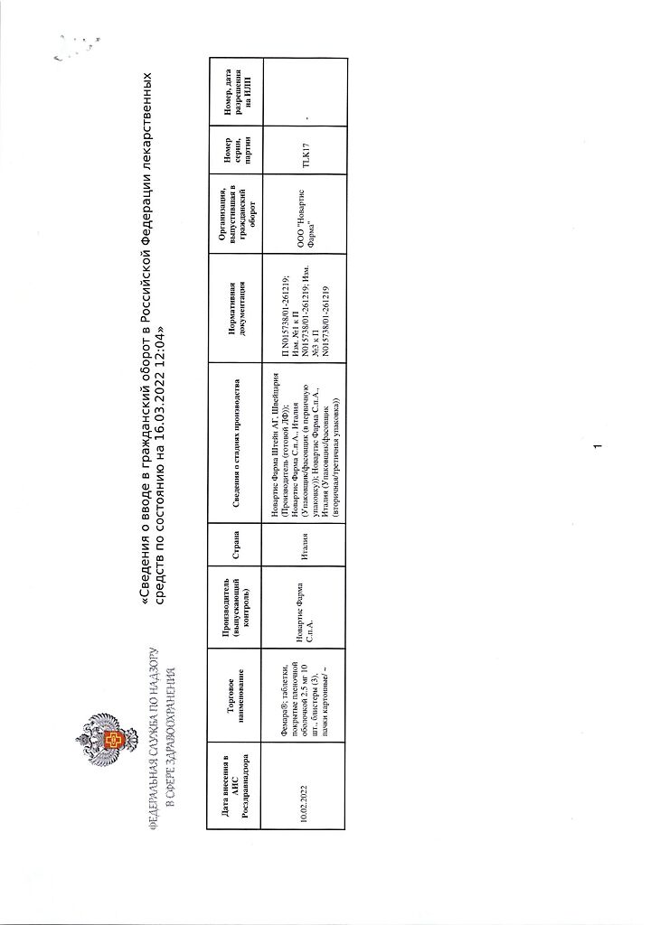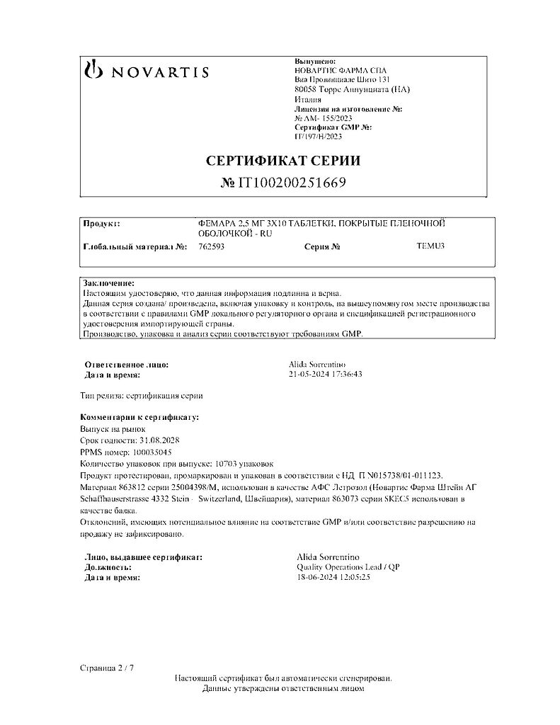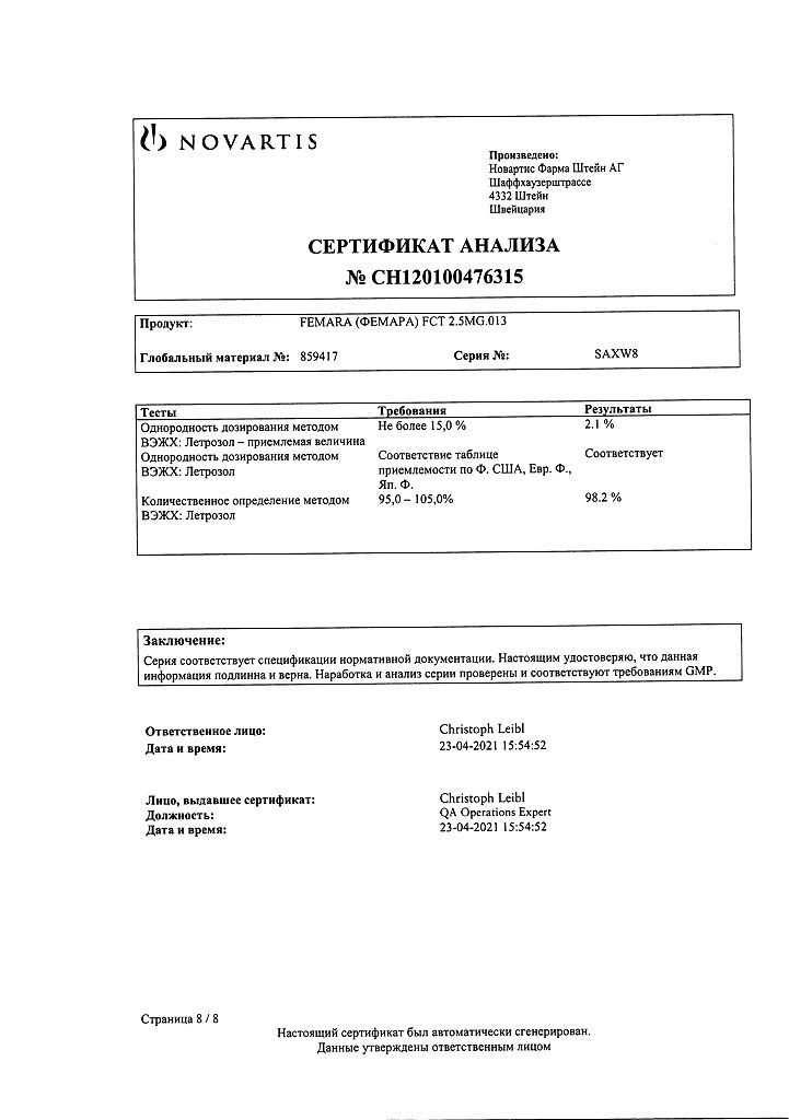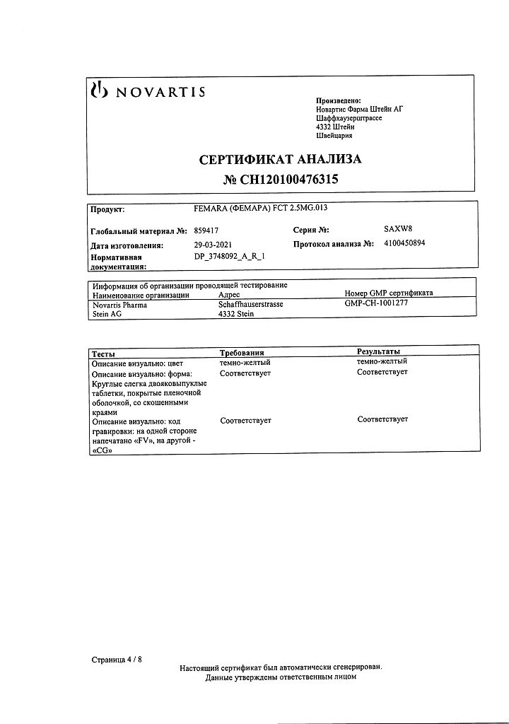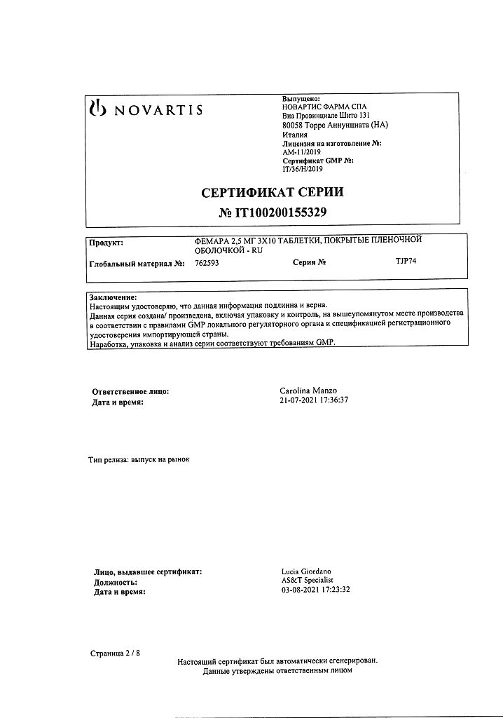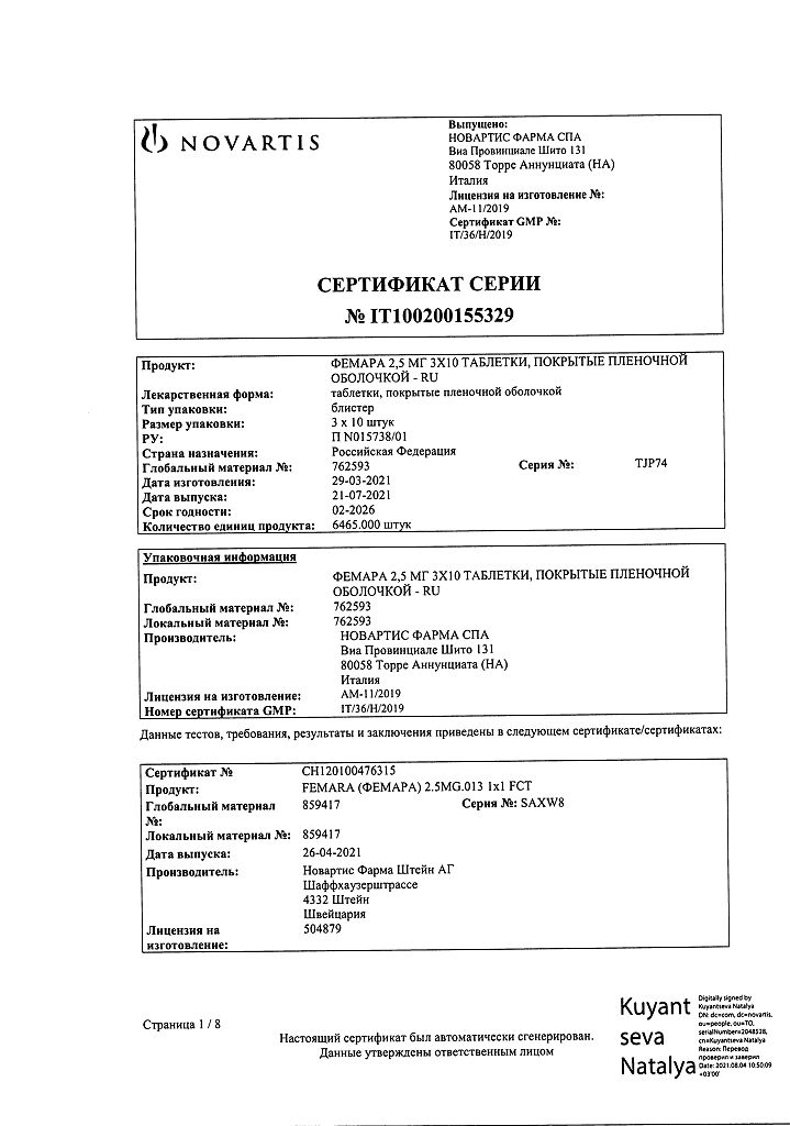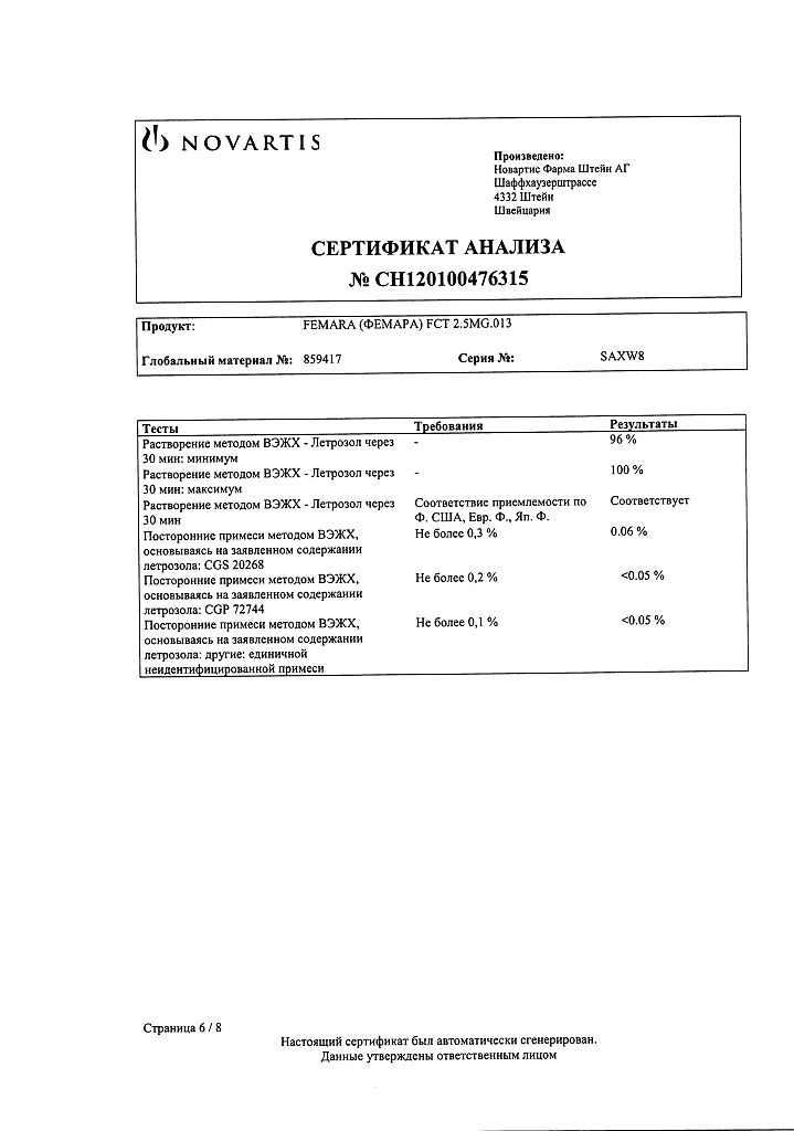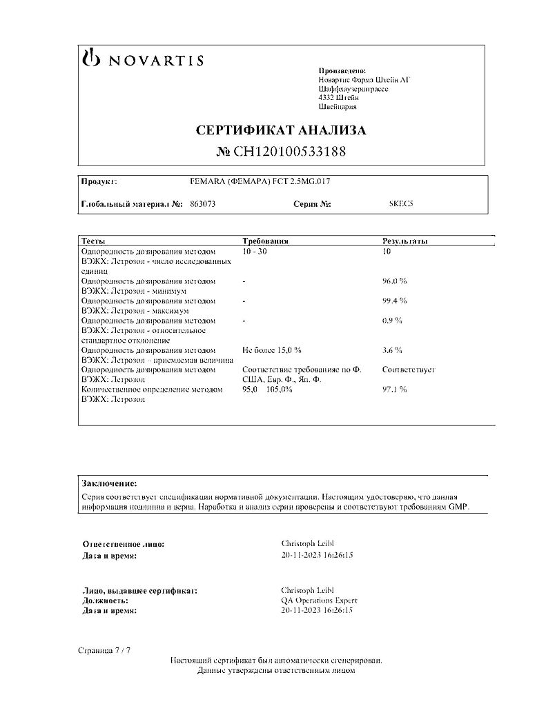 Для взрослых рекомендуемая доза препарата Фемара® составляет 2,5 мг 1 раз/сутки, ежедневно длительно.
