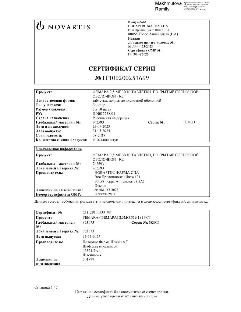 Имеются отдельные сообщения о случаях передозировки препарата Фемара®.