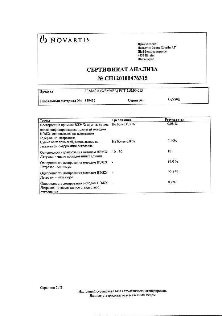 На фоне лечения Фемарой слабо повышается частота остеопороза (6,9% по сравнению с 5,5% в группе плацебо). Однако частота переломов костей у пациенток, получающих препарат Фемара®, не отличается от таковой у здоровых людей того же возраста.