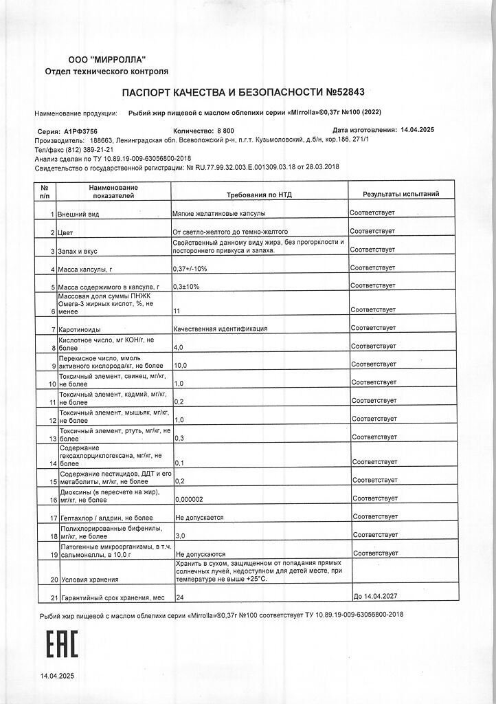Документы Mirrolla Рыбий жир с маслом облепихой капсулы массой 370 мг 100 шт