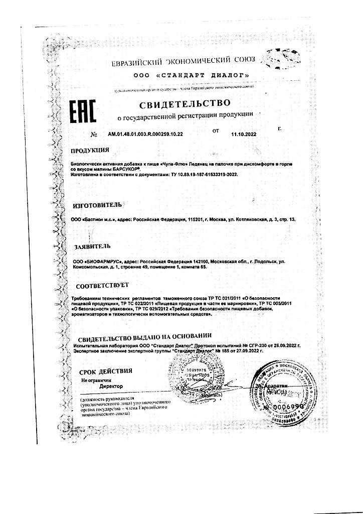 Документы Чупа-Флю Леденец на палочке при дискомфорте в горле со вкусом малины 1 шт