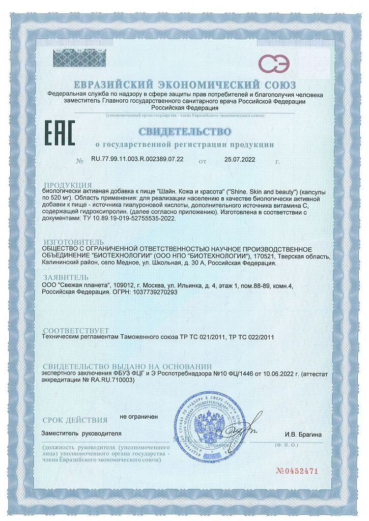 Рекомендуется в качестве биологически активной добавки к пище - источника гиалуроновой кислоты, дополнительного источника витамина С, содержащей гидроксипролин.
