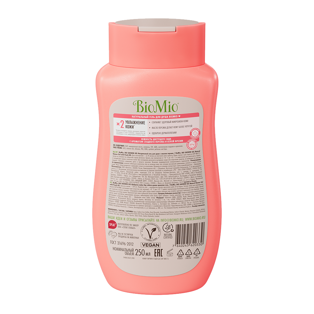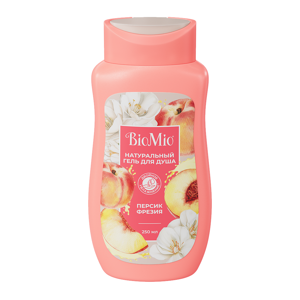 Перенеситесь в атмосферу цветущего сада с нежной новинкой BioMio! Натуральный гель для душа персик-фрезия на 98% состоит из ингредиентов натурального происхождения. Аромат сладкого персика с нотами белой фрезии напомнит о самых теплых моментах, а масло персика сделает кожу более упругой. Инновационный запатентованный комплекс из алоэ вера и бетаина увеличивает в клетках кожи количество белков-аквапоринов, которые доставляют воду в эпидермис. Гель очищает, увлажняет, сохраняет здоровый микробиом кожи тела. Одобрен дерматологами.