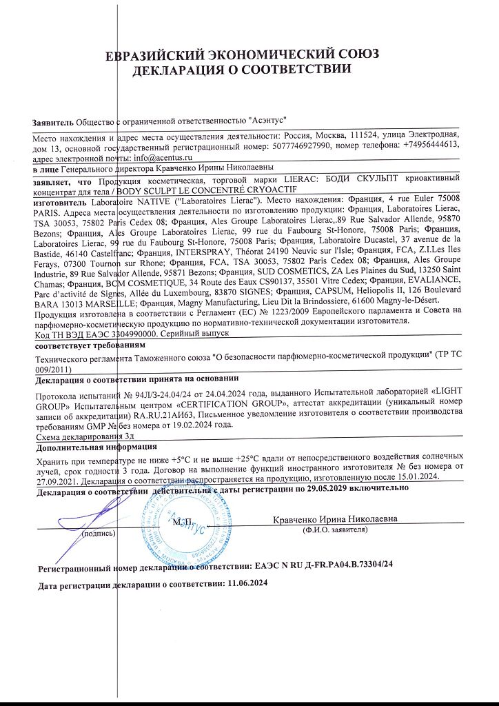 Документы Lierac Body Sculpt Криоактивный концентрат для тела 150 мл 1 шт