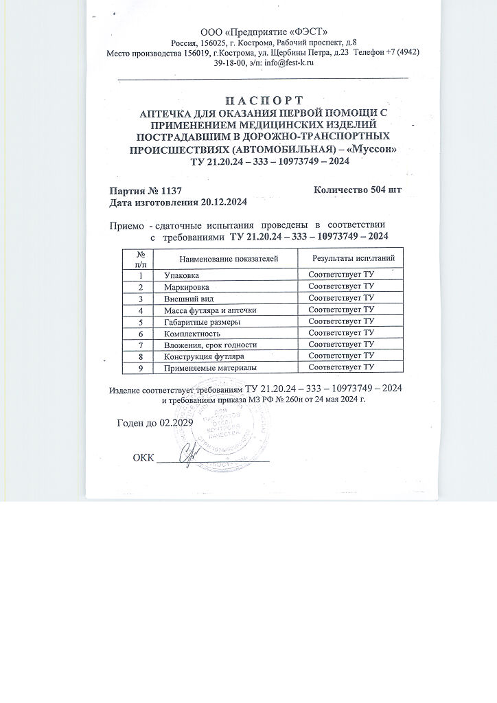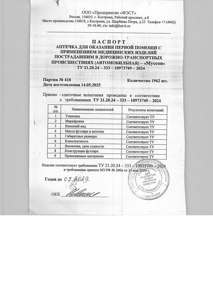 Документы Аптечка первой помощи ФЭСТ автомобильная Муссон приказ №260н 1 шт