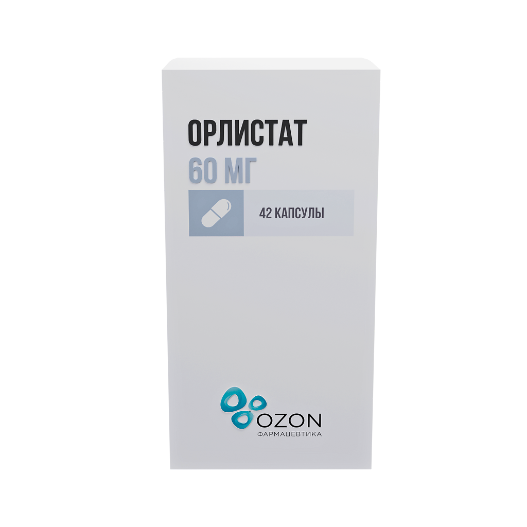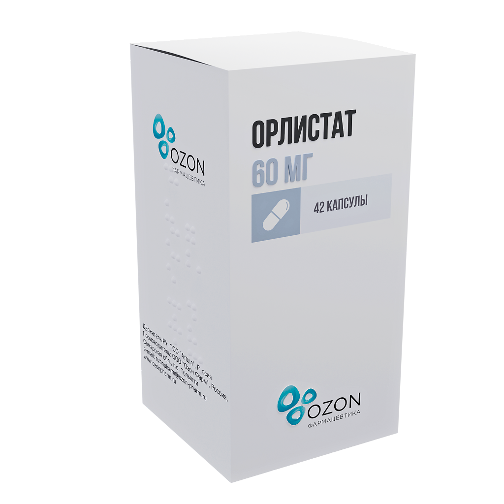 Действующее вещество: орлистат, субстанция-пеллеты 50 % - 120,00 мг, в пересчете на орлистат – 60,00 мг.