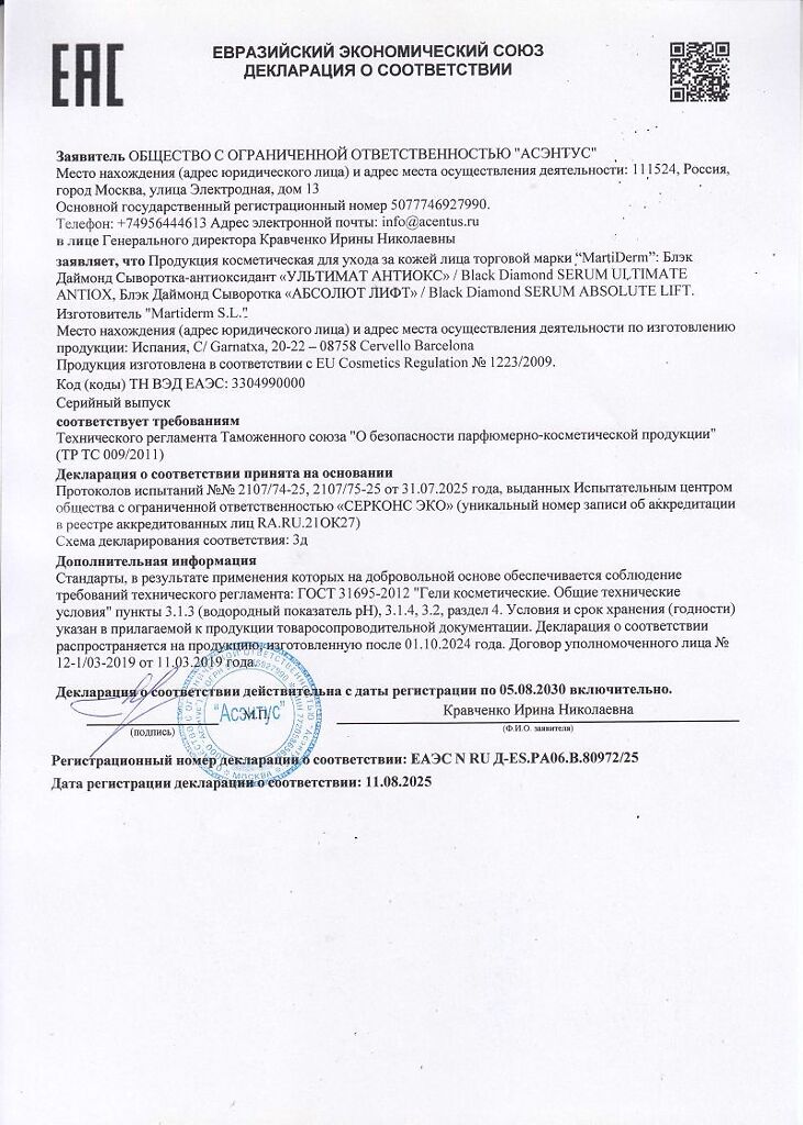 Документы MartiDerm Black Diamond Absolute Lift Сыворотка для всех типов кожи 30 мл 1 шт