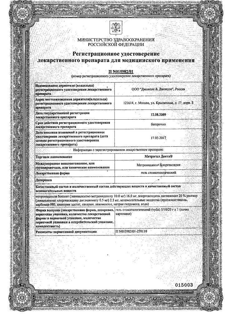 При пародонтите: после снятия зубных отложений, пародонтальные карманы обрабатываются гелем Метрогил Дента, и производится аппликация геля на область десен. Время экспозиции – 30 мин. Количество процедур зависит от тяжести заболевания. В дальнейшем аппликации геля больной может проводить самостоятельно. Метрогил Дента наносится на область десен 2 раза в день в течение 7-10 дней.