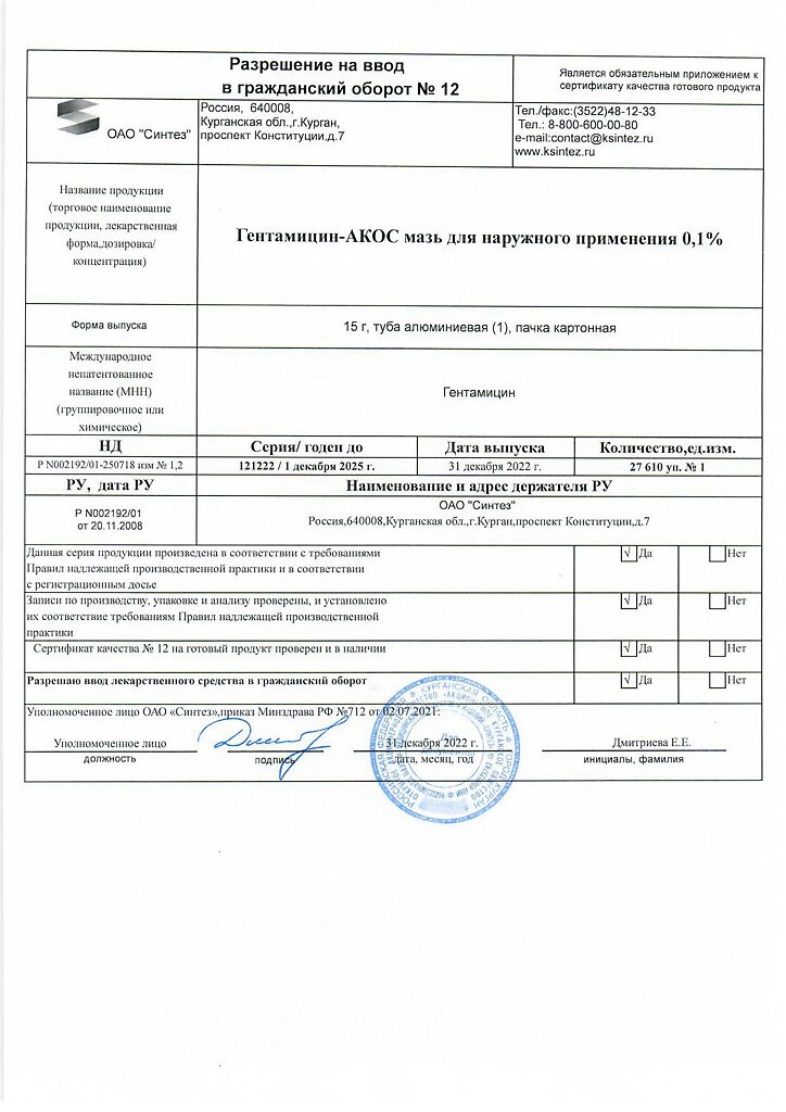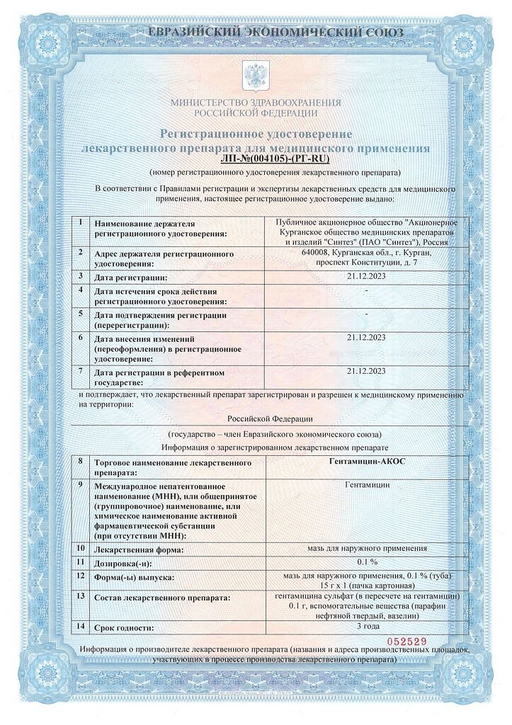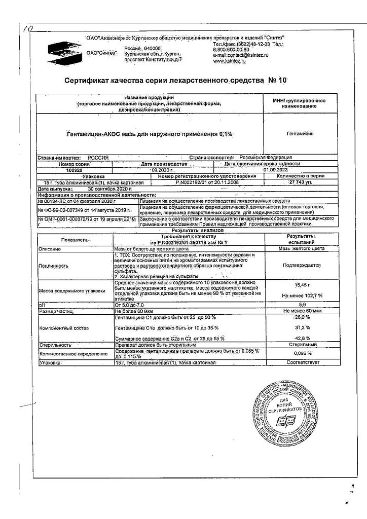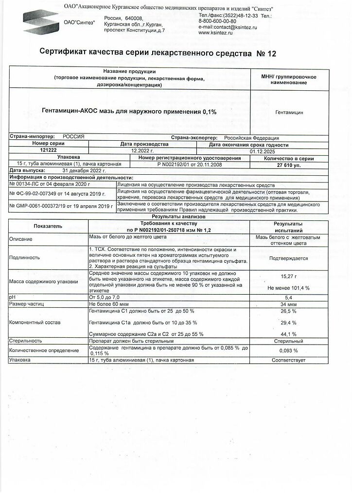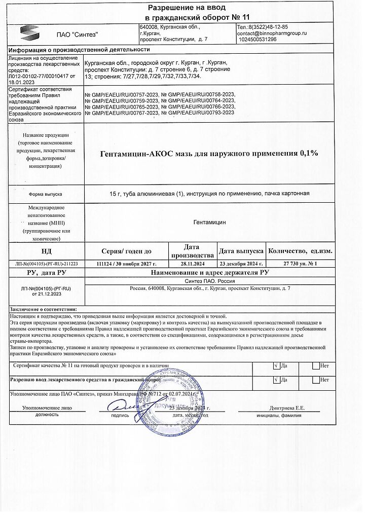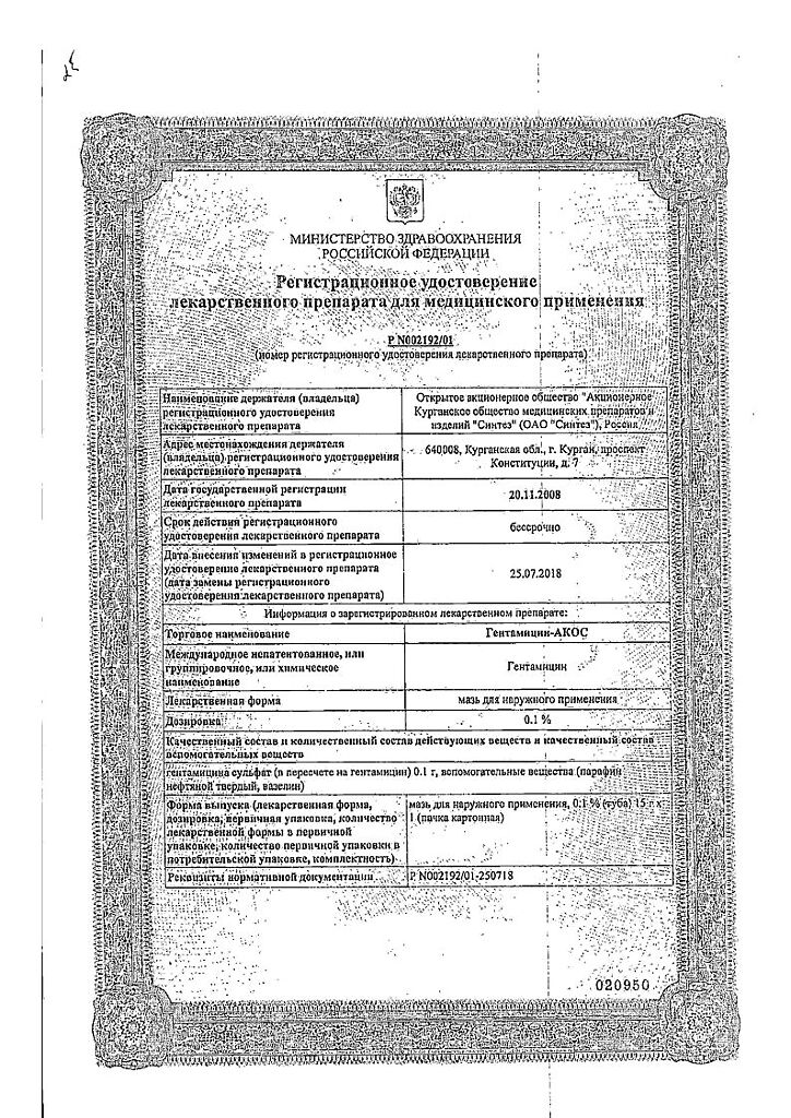 Документы Гентамицин-АКОС мазь для наружного применения 0,1 % 15 г 1 шт