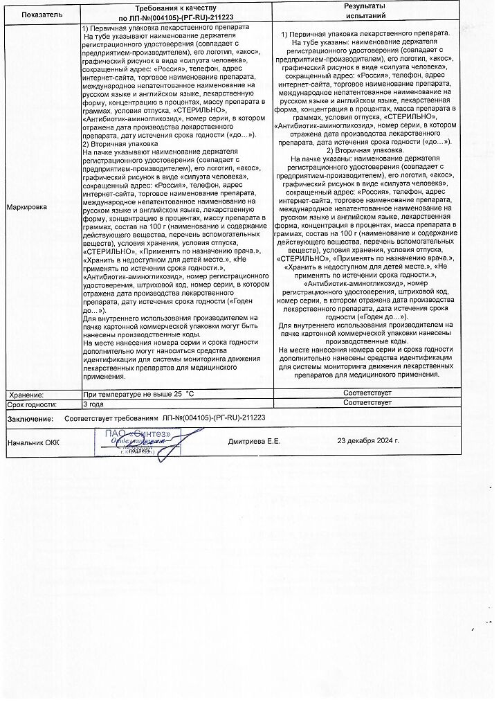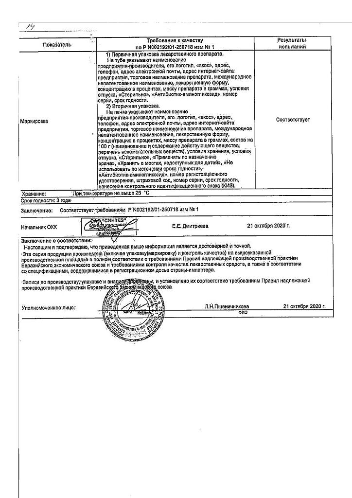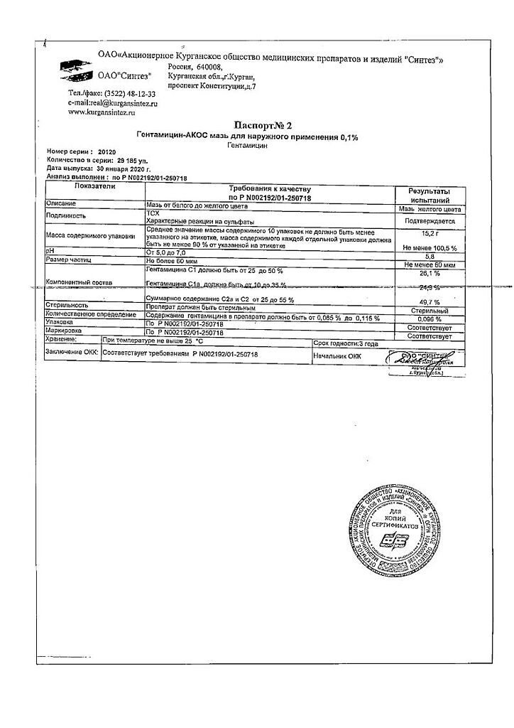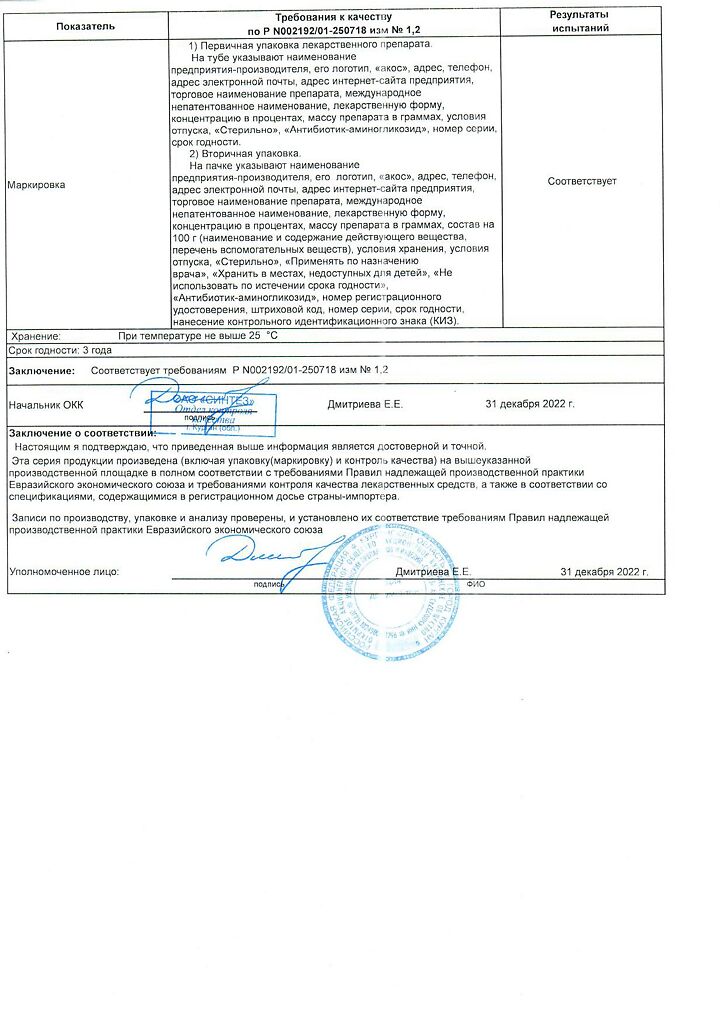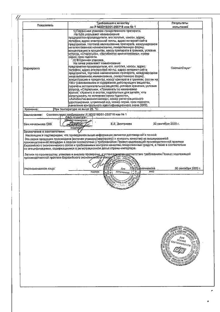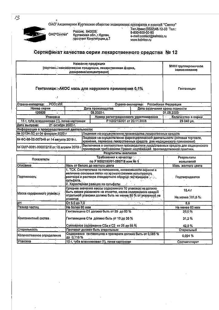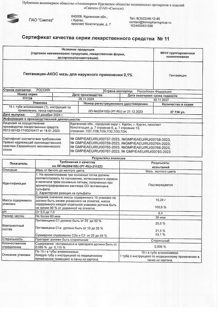 Документы Гентамицин-АКОС мазь для наружного применения 0,1 % 15 г 1 шт