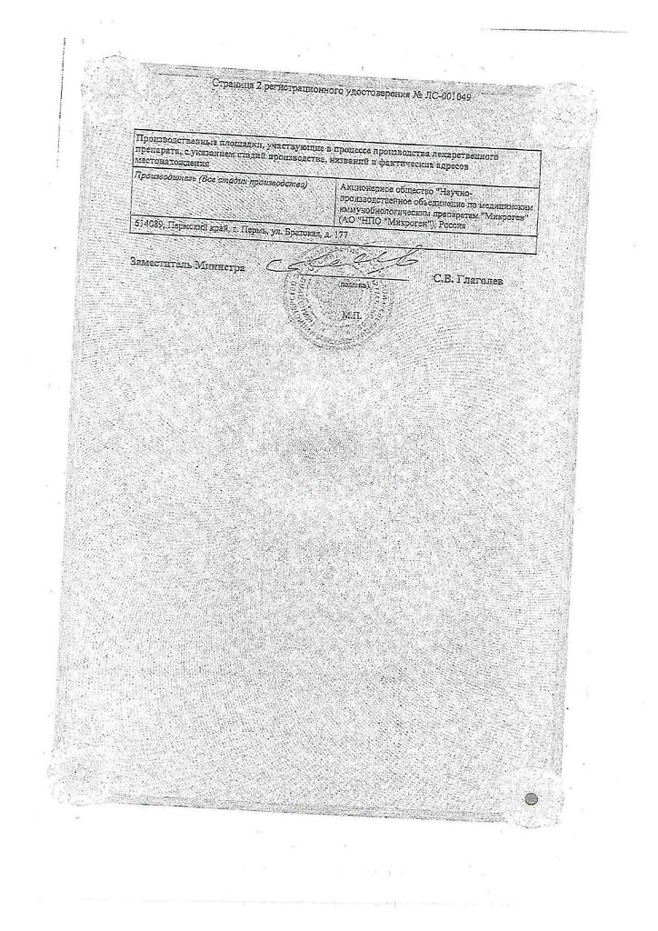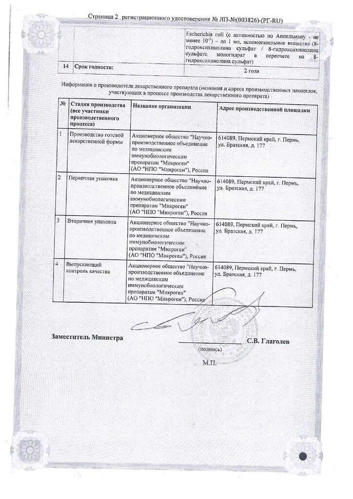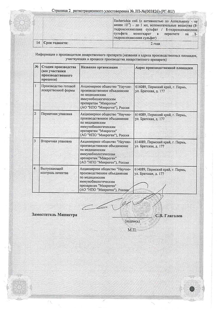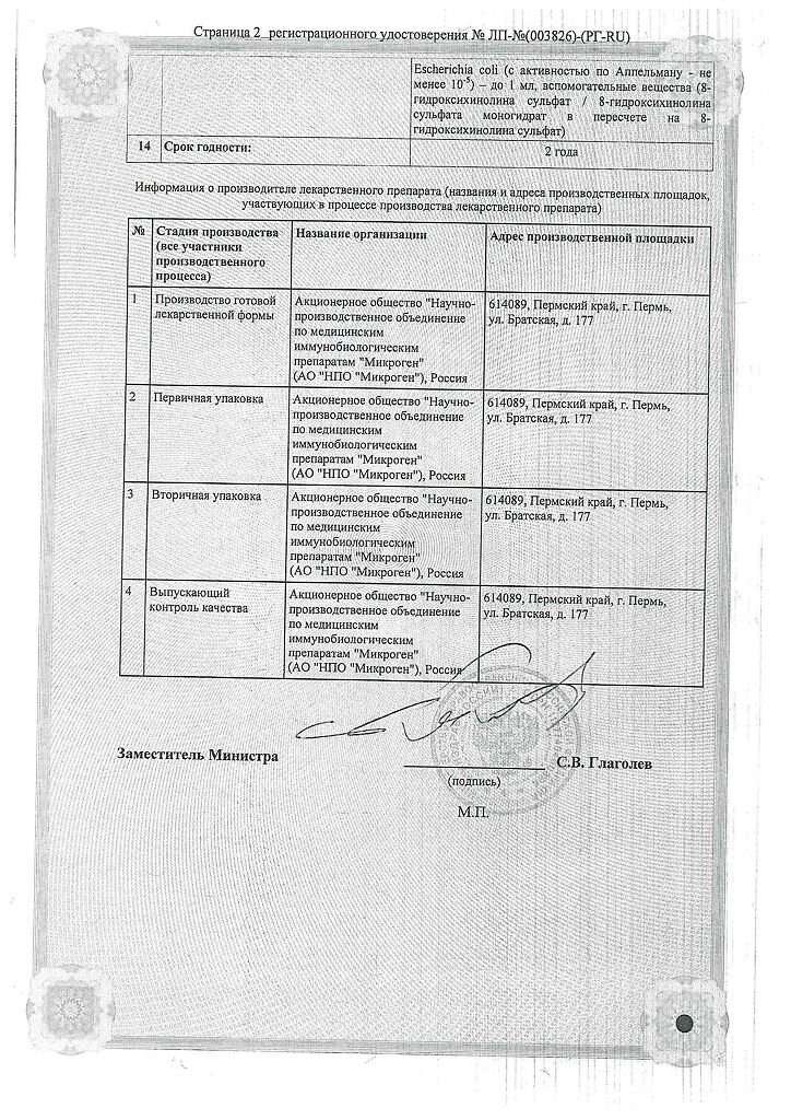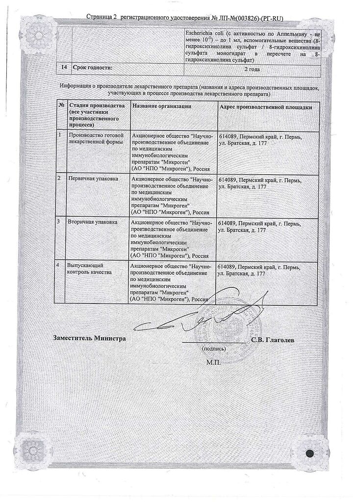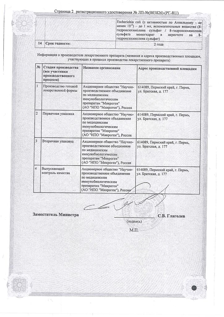 Стерильные очищенные фильтраты фаголизатов бактерий Staphylococcus spp., Streptococcus spp., Proteus (P. vulgaris, P. mirabilis), Pseudomonas aeruginosa, Klebsiella pneumoniae, энтеропатогенных Escherichia coli (с активностью по Аппельману - не менее 10-5) – до 1 мл.