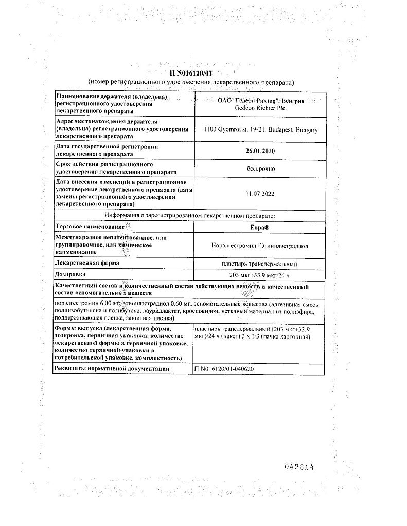 Документы Евра пластырь трансдермальный 203 мкг+39,9 мкг/24 ч 3 шт