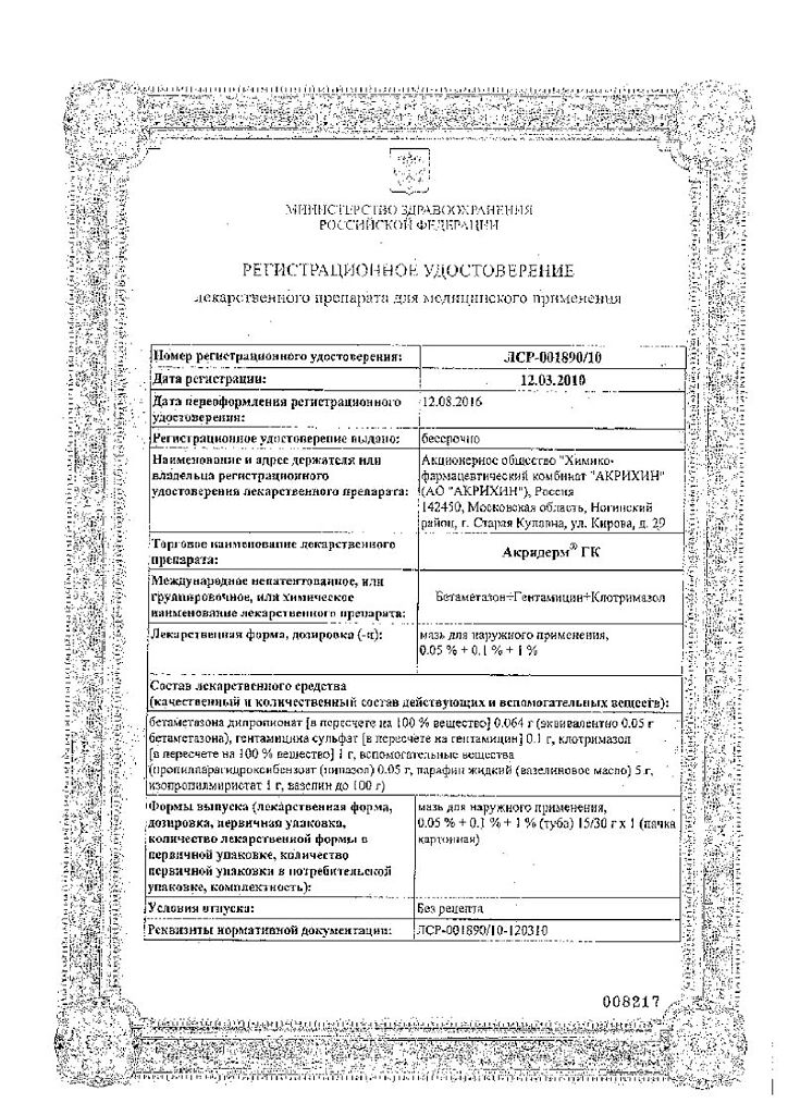 Действующее вещество: Бетаметазон, Гентамицин, Клотримазол