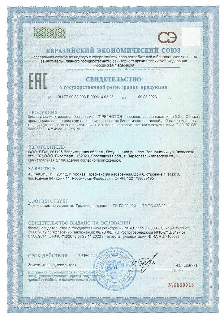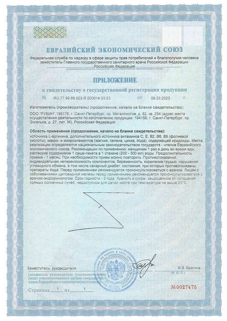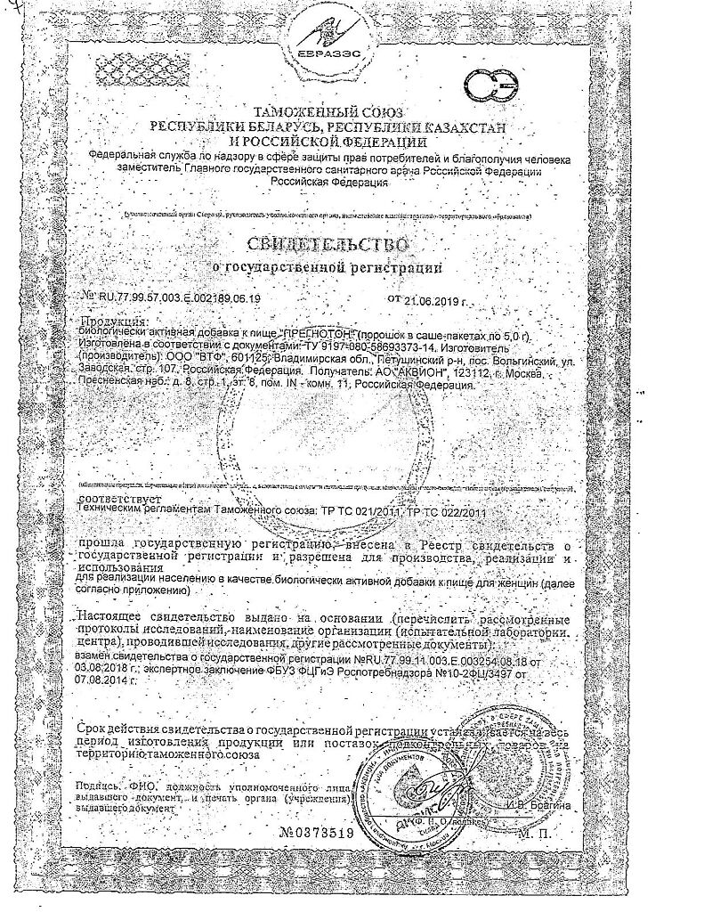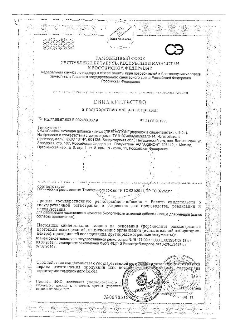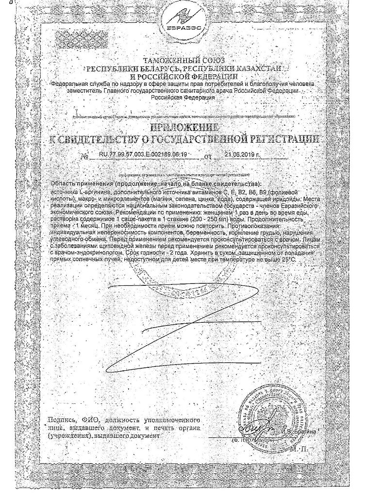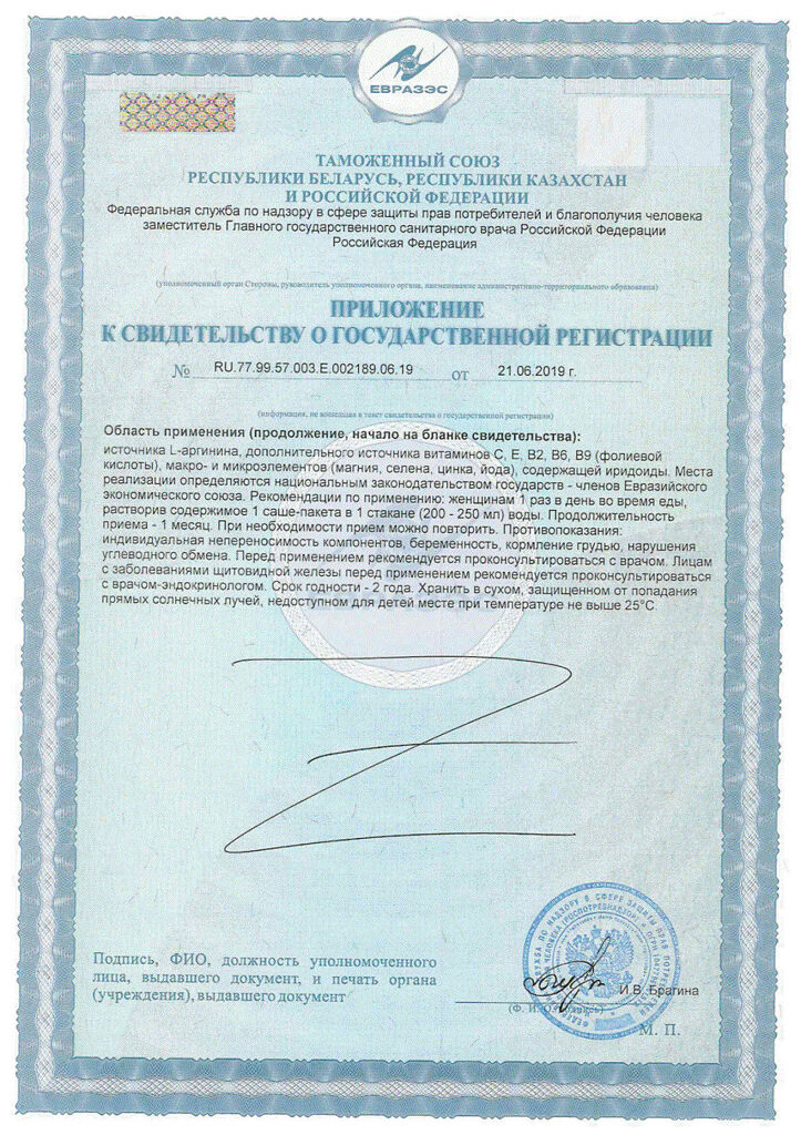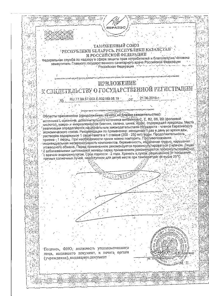Порядок применения и дозировки: женщинам 1 раз в день во время еды, растворив содержимое 1 саше-пакета в 1 стакане (200 – 250 мл) воды.