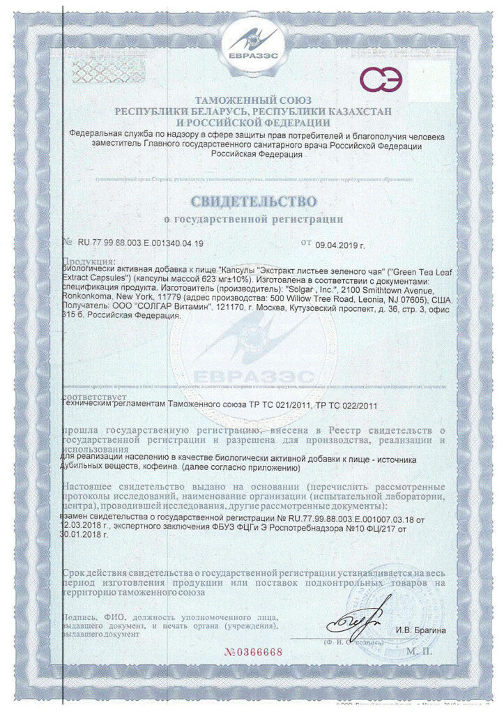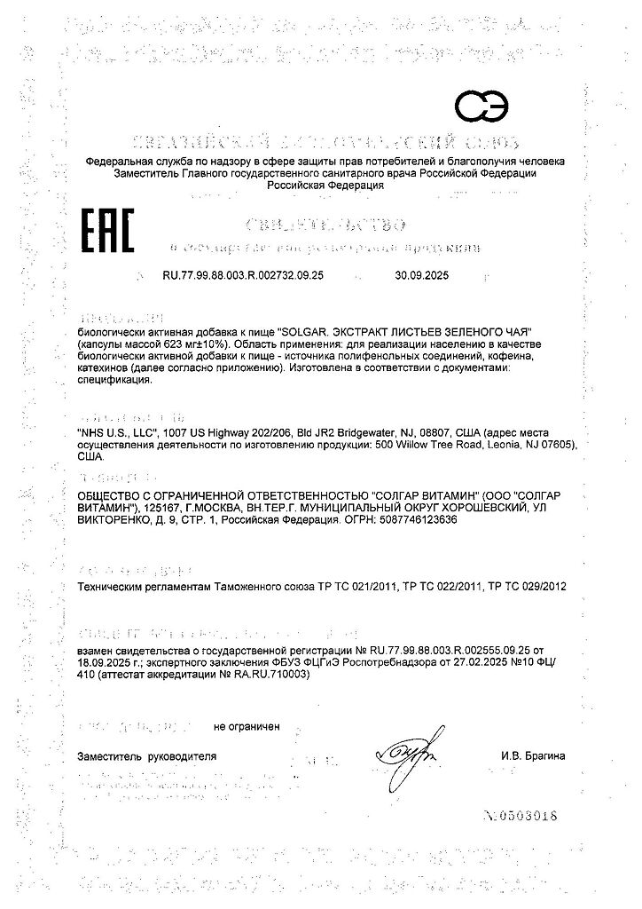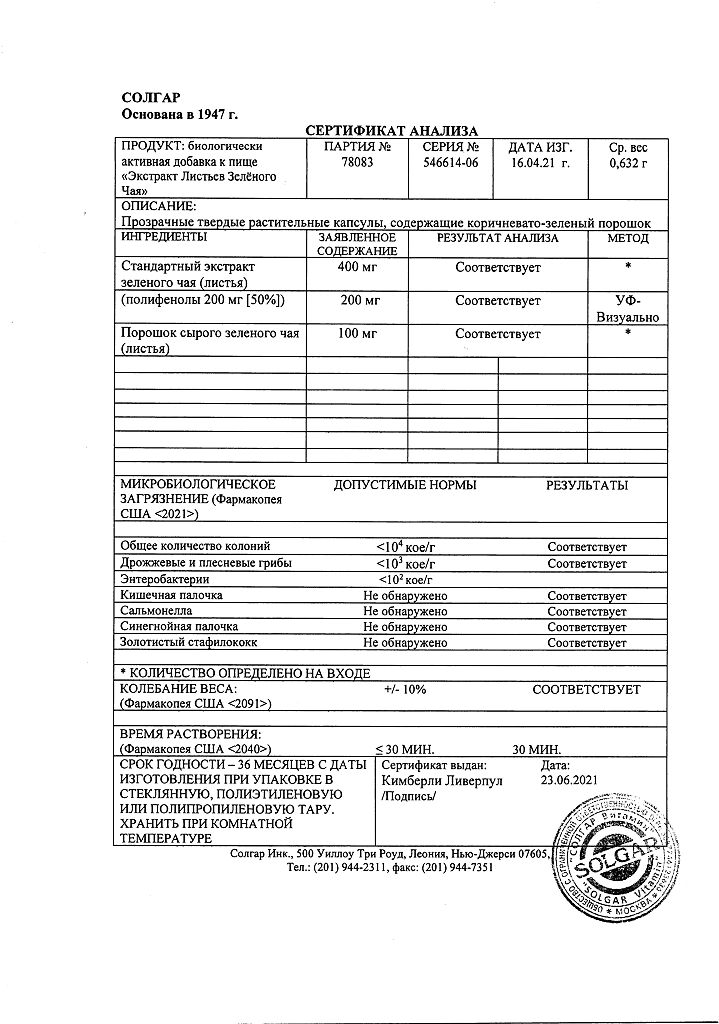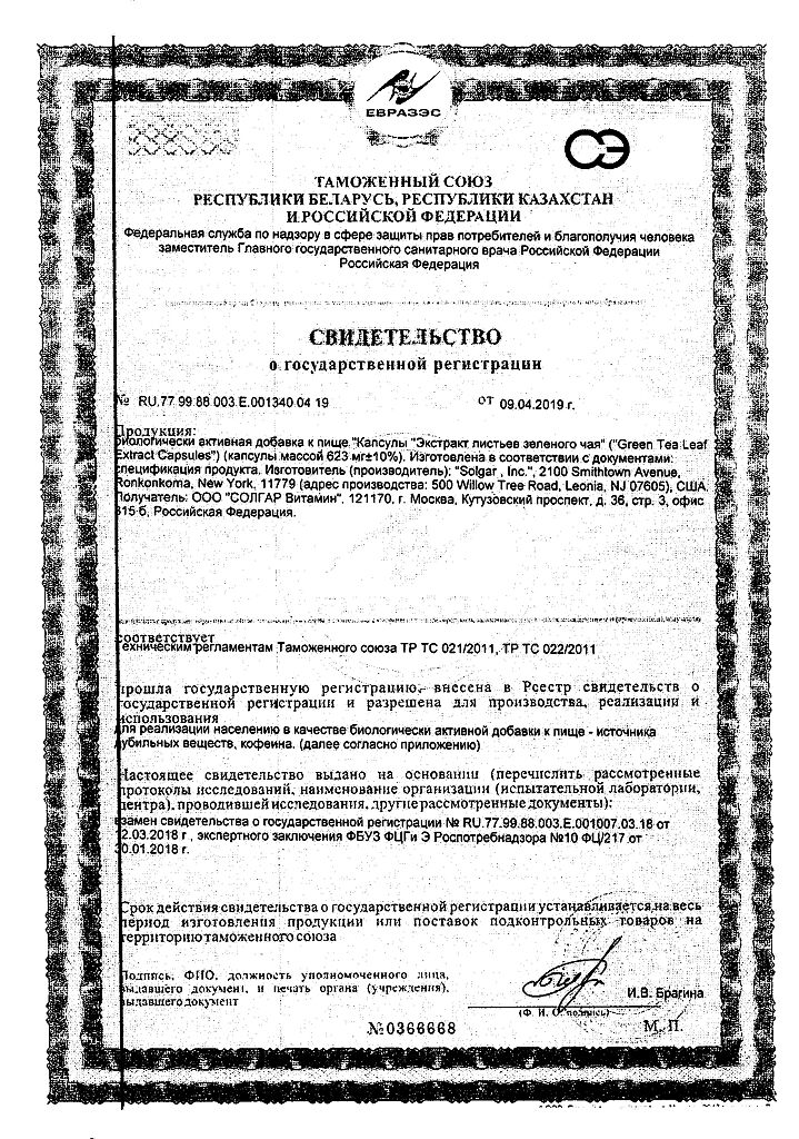 Документы Solgar Экстракт листьев Зеленого чая / Green Tea Leaf Extract Capsules капсулы массой 623 мг 60 шт