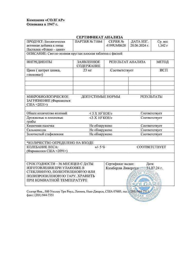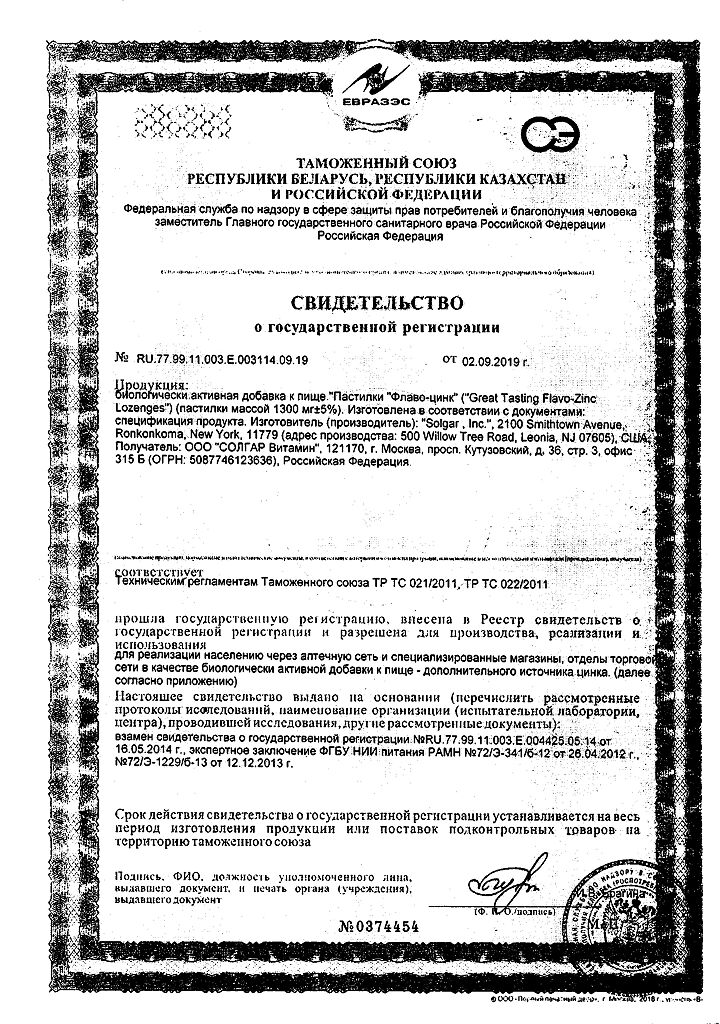 Документы Solgar Флаво-цинк / Great Tasting Flavo-Zinc Lozenges пастилки массой 1300 мг 50 шт