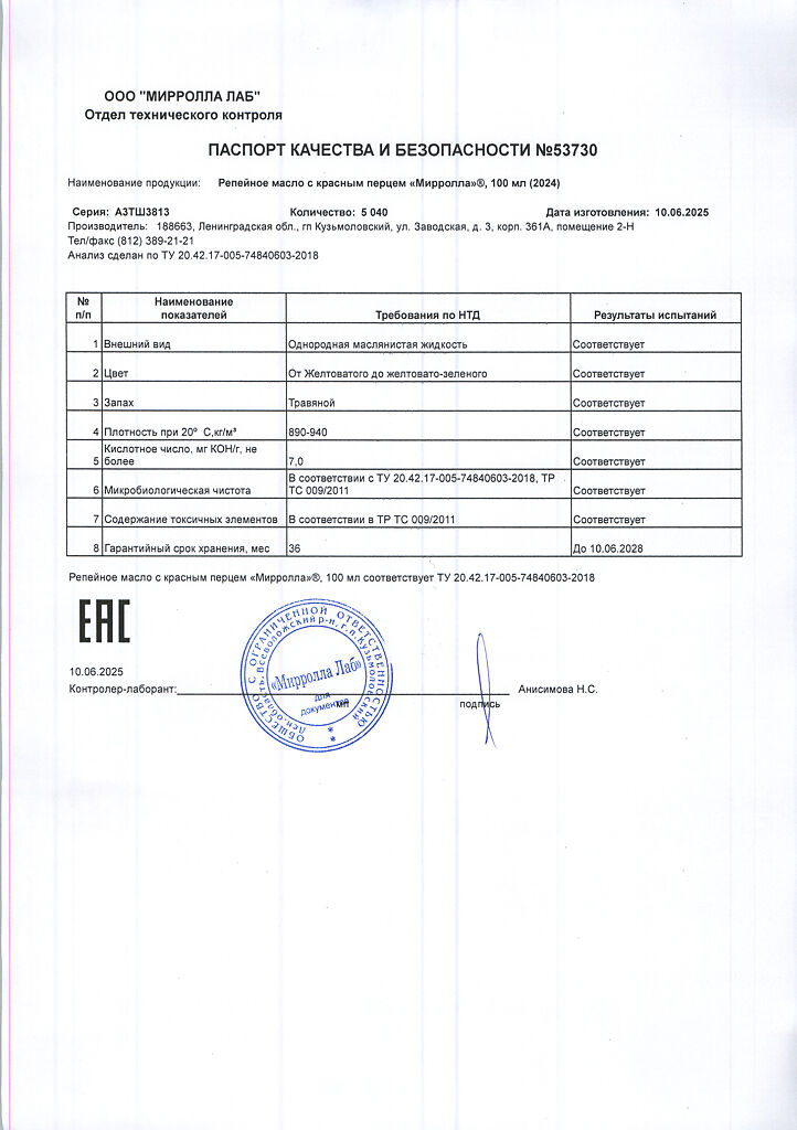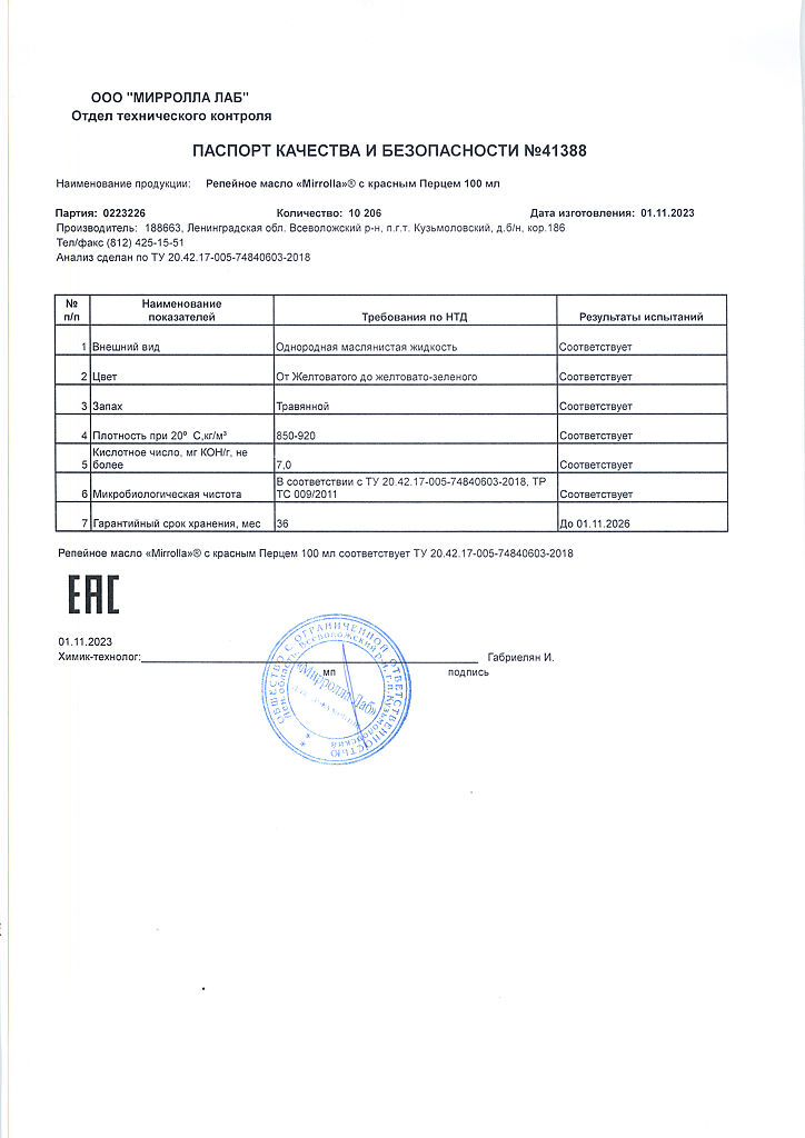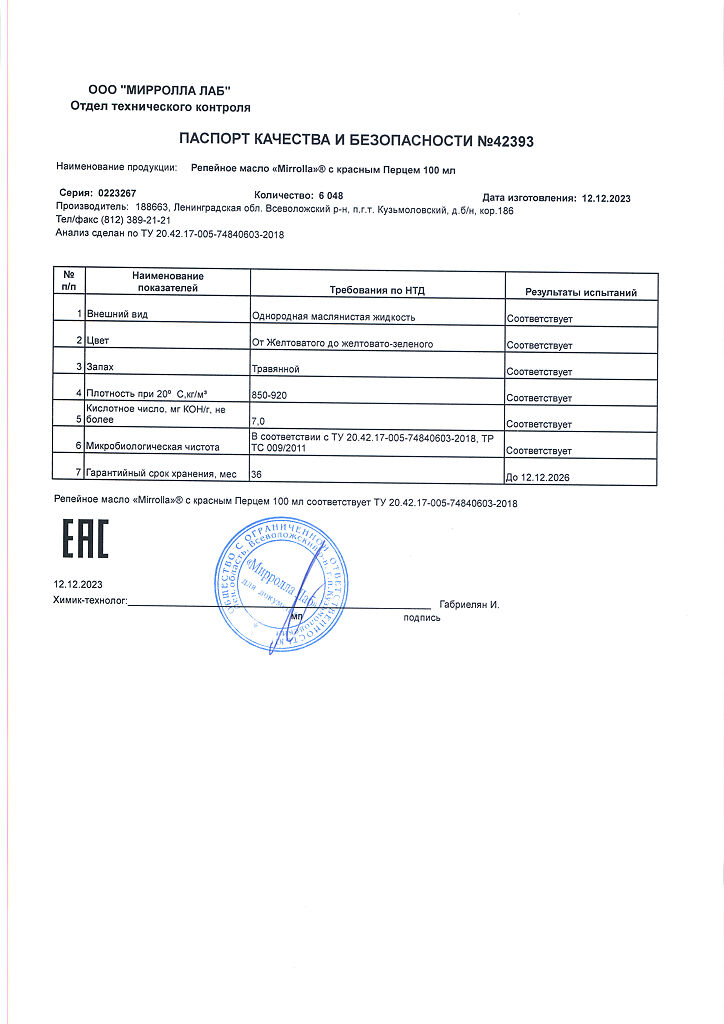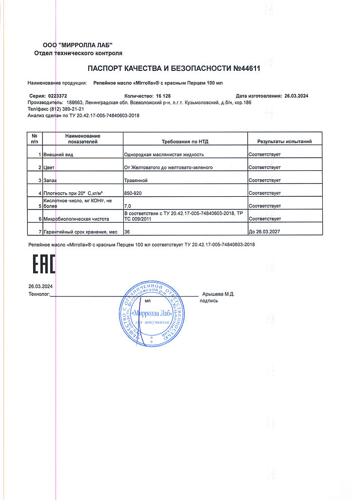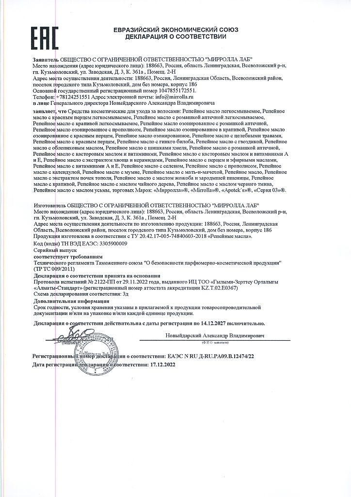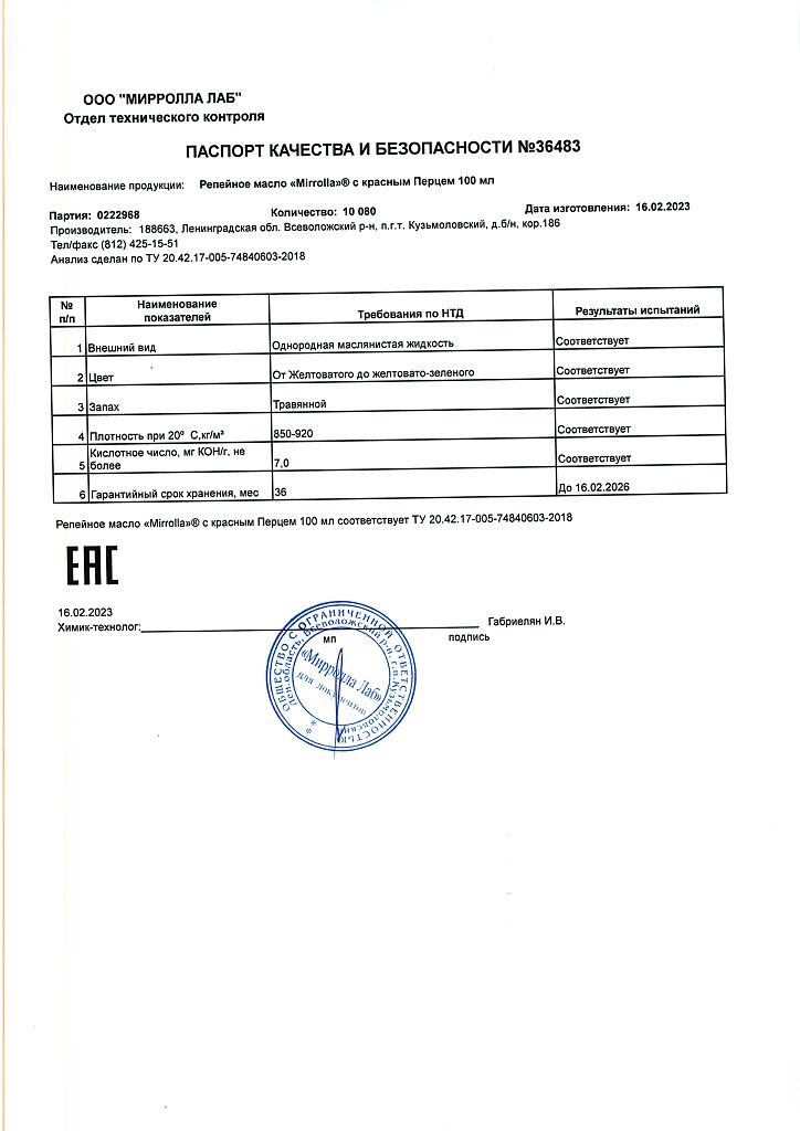 Документы Mirrolla Репейное масло с красным перцем 100 мл 1 шт