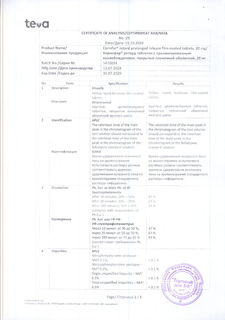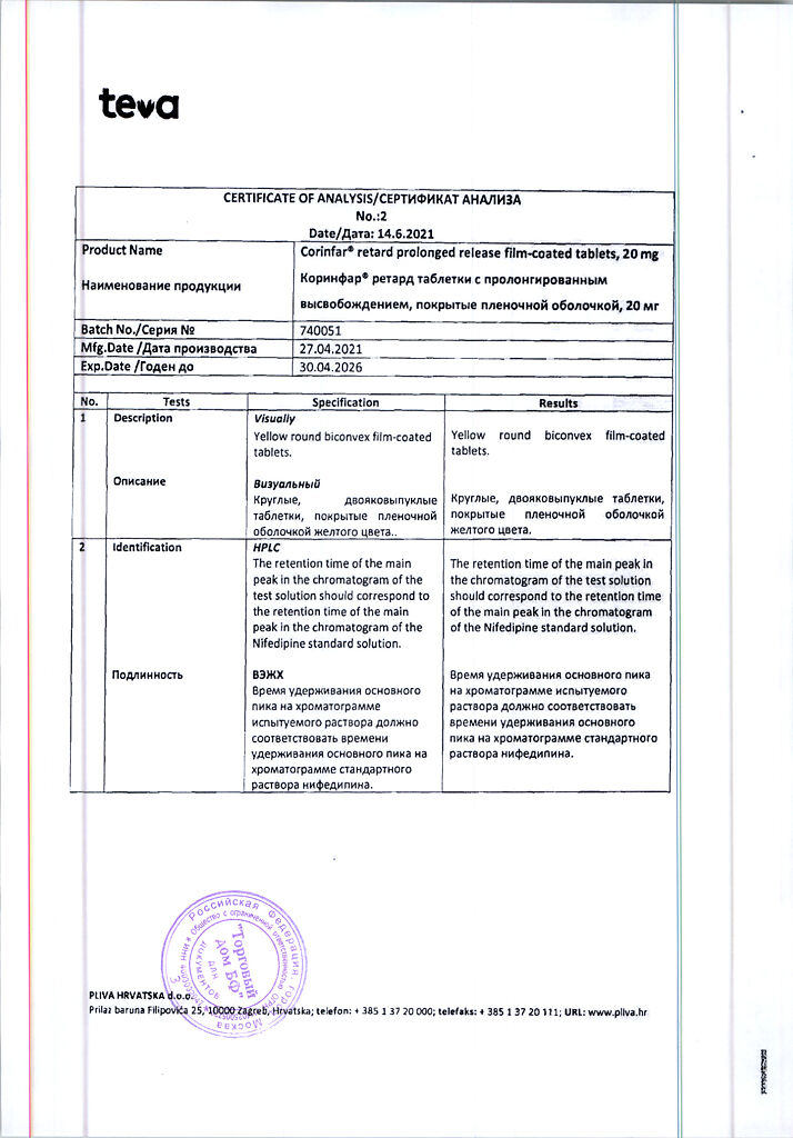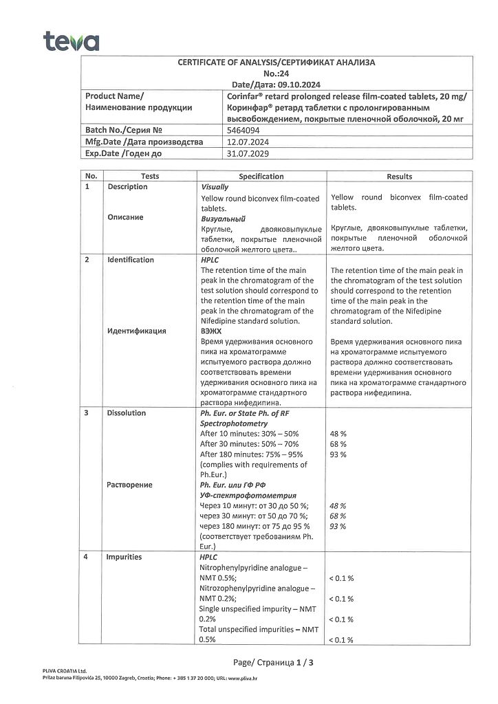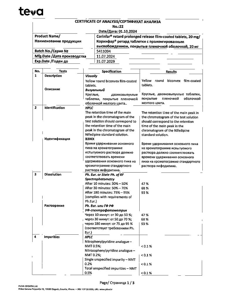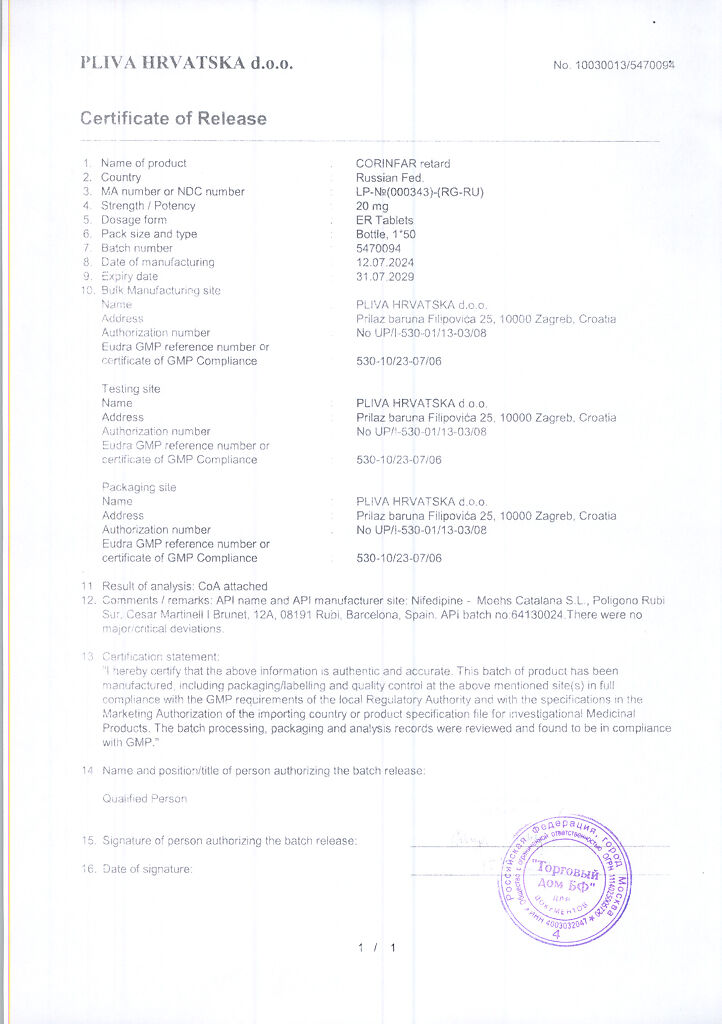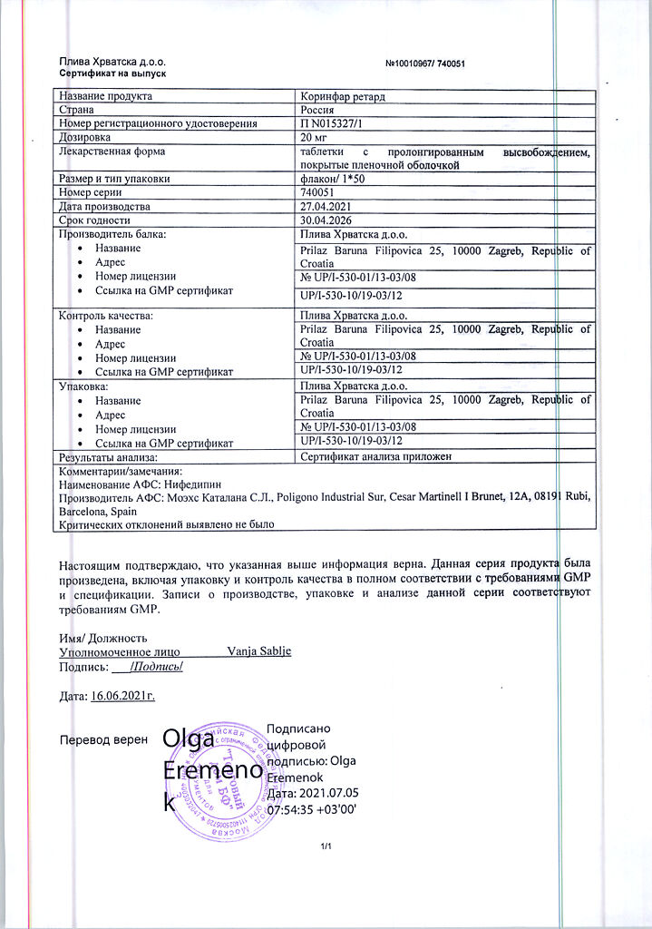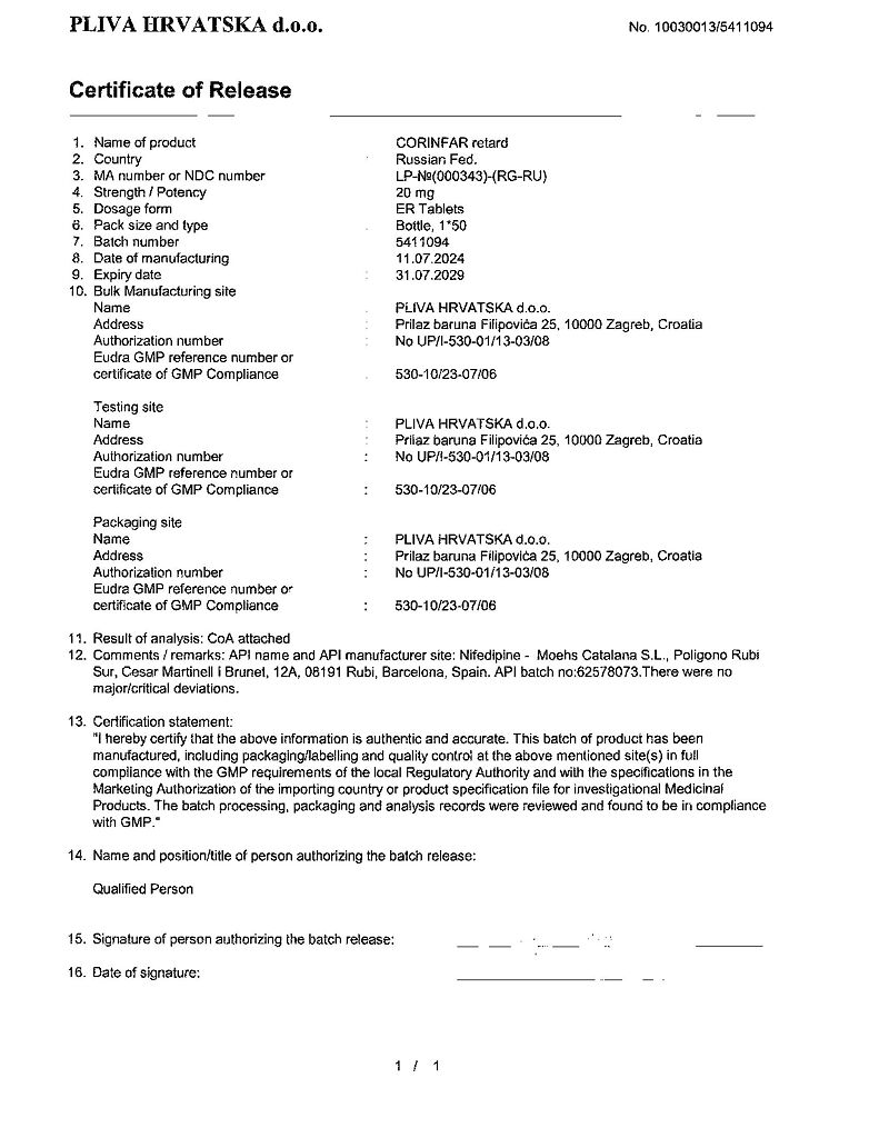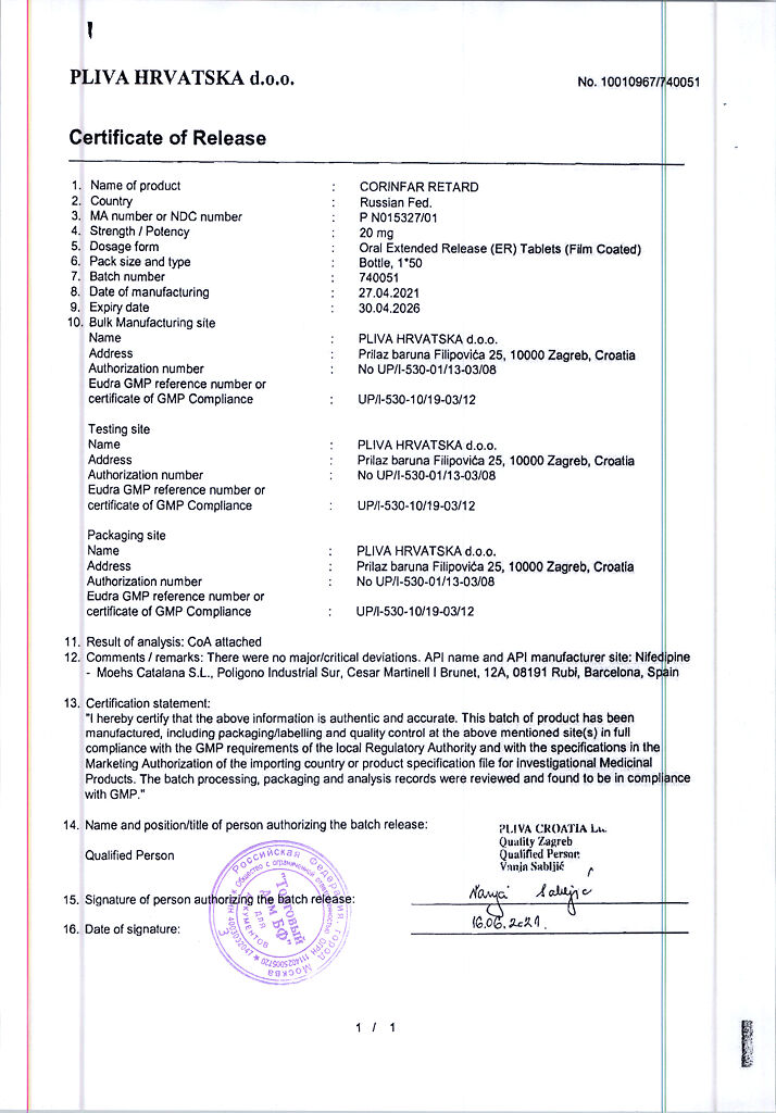 Действующее вещество: Нифедипин