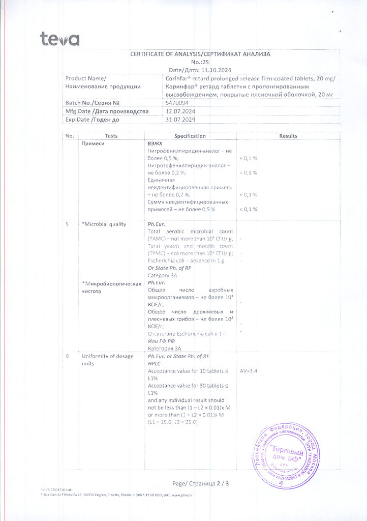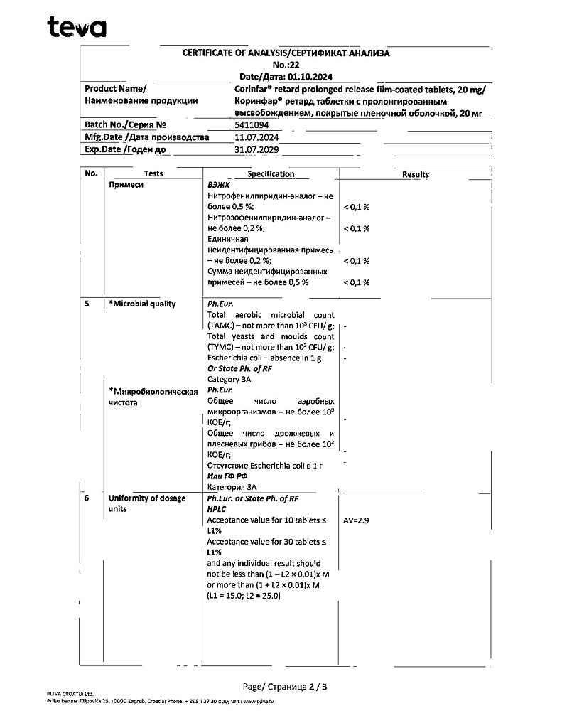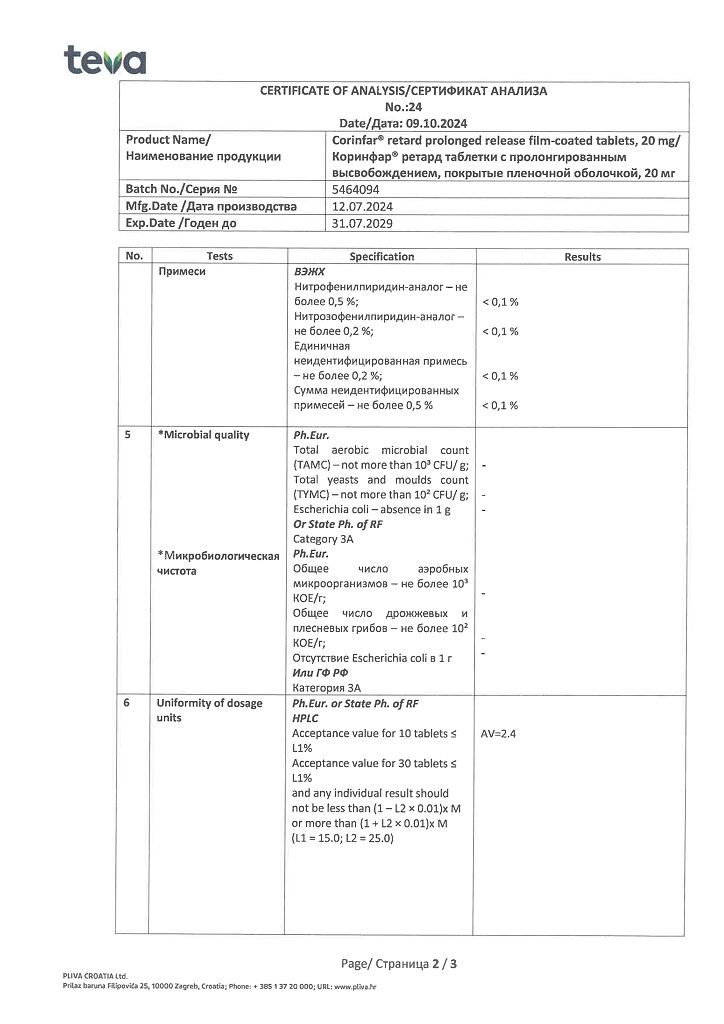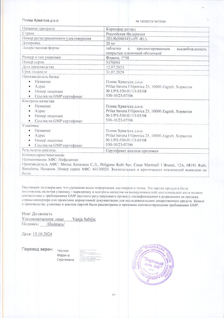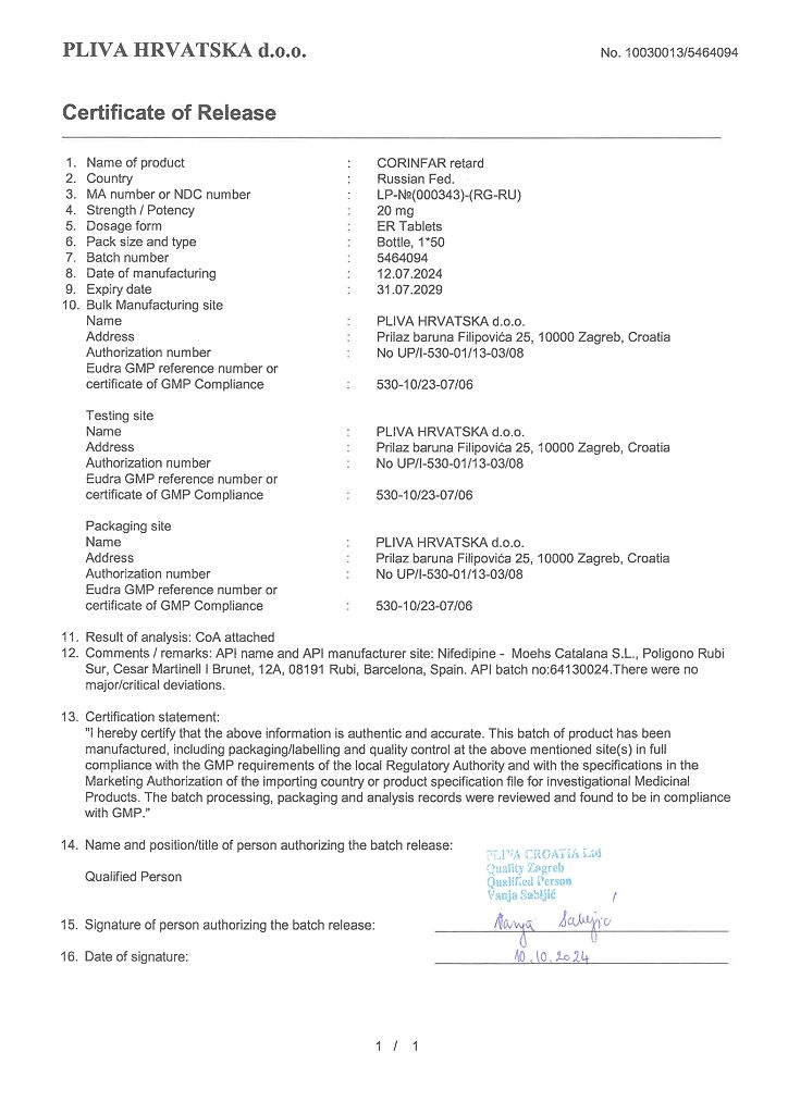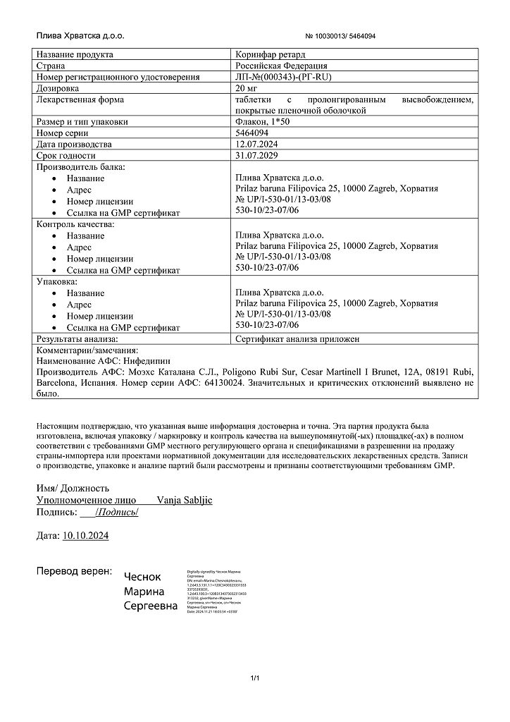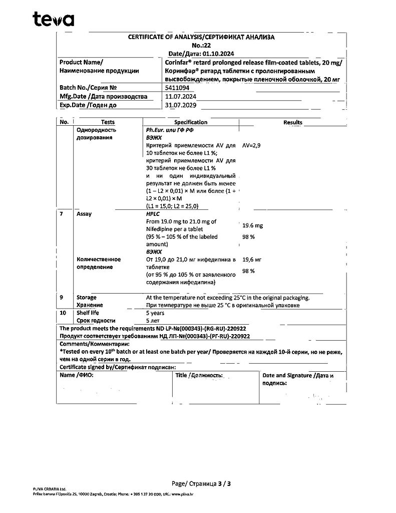 Действующее вещество: Нифедипин