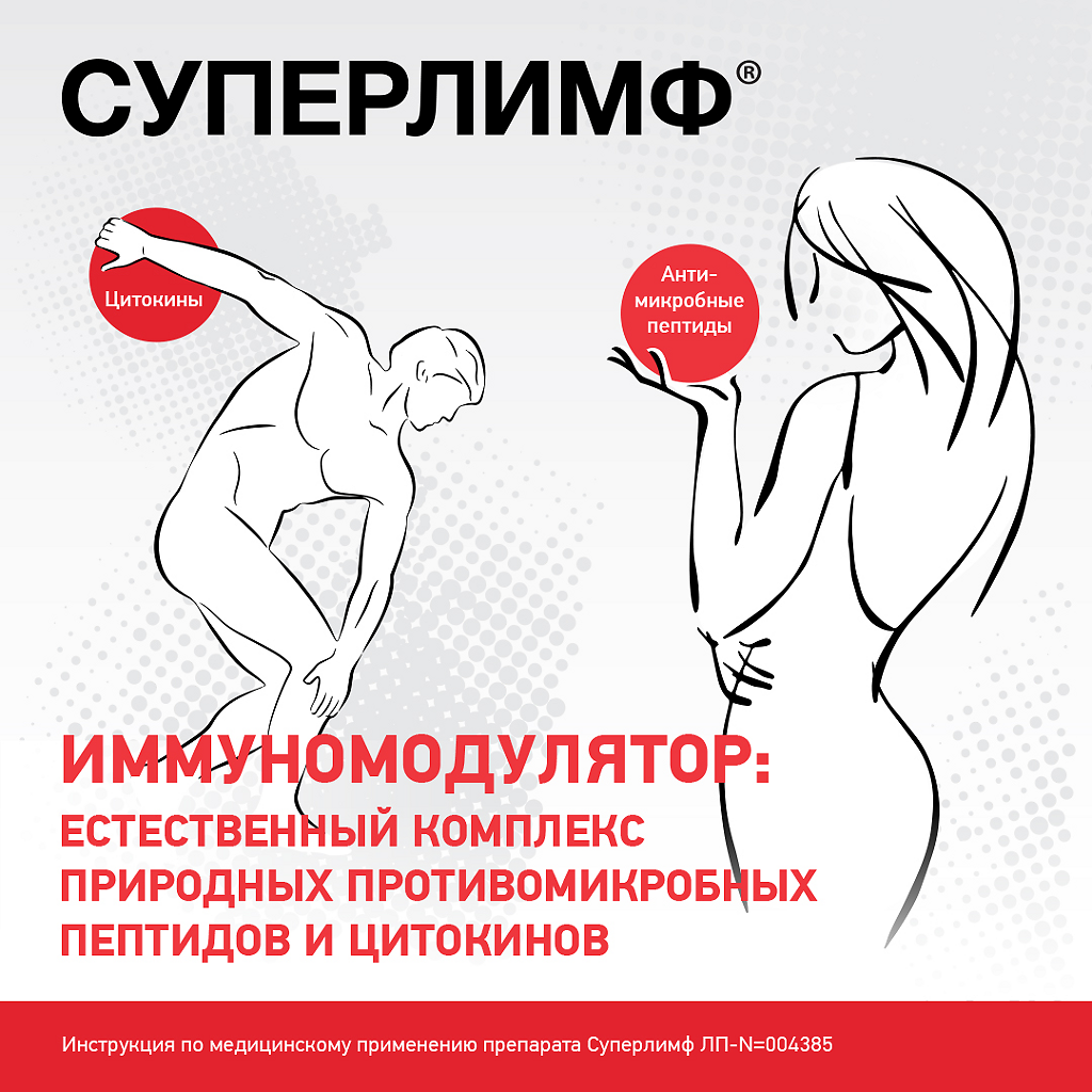 Суперлимф® является иммуномодулятором, представляет собой естественный комплекс природных противомикробных пептидов и цитокинов - универсальных стимуляторов иммунной системы с активностью фактора, угнетающего миграцию макрофагов, интерлейкина 1 (ИЛ-1), ИЛ-6, фактора некроза опухоли (ФНО), трансформирующего фактора роста, секретируемых лейкоцитами периферической крови свиньи.