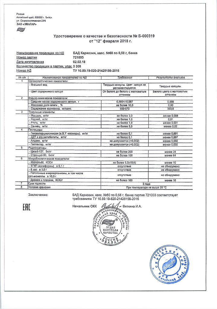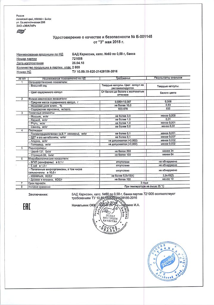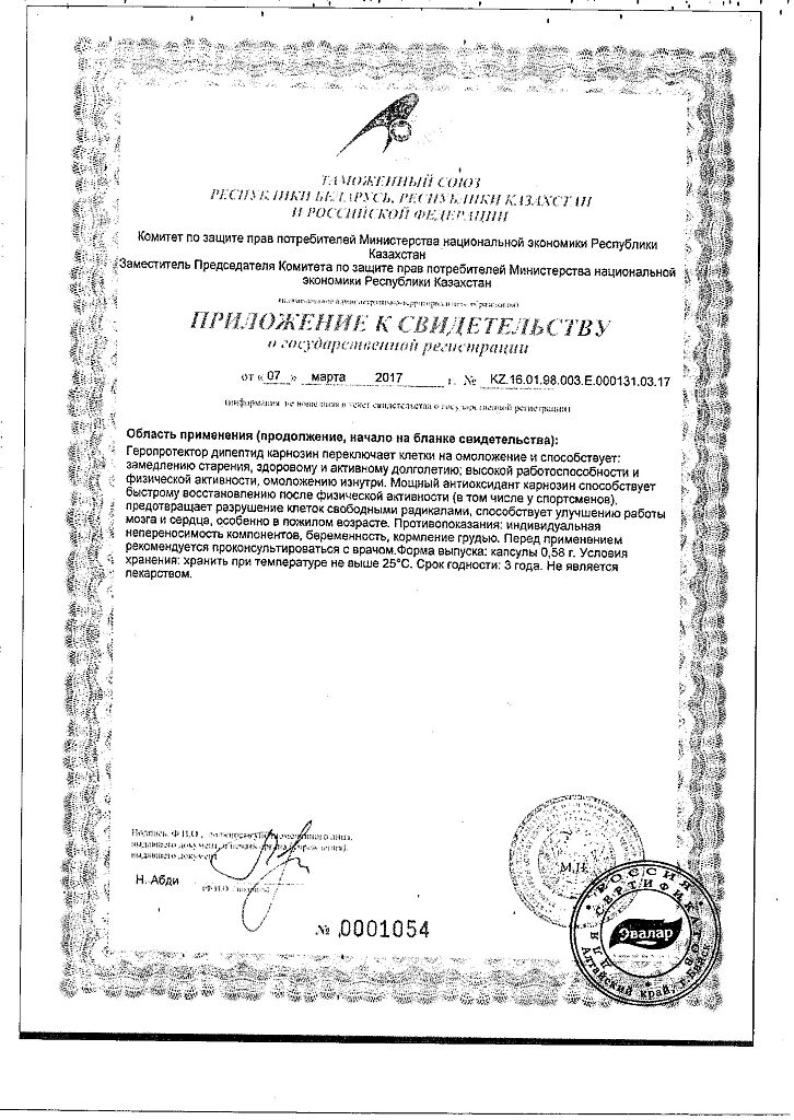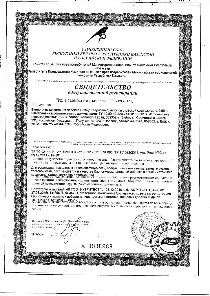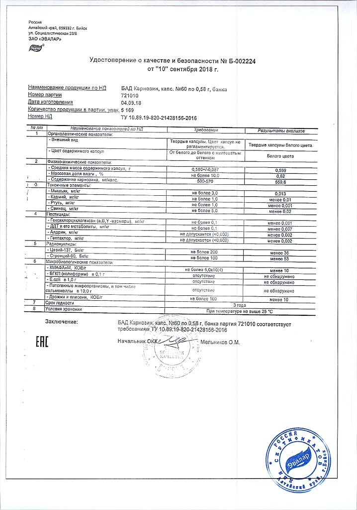 Документы Карнозин Эвалар капсулы по 0,58 г 60 шт