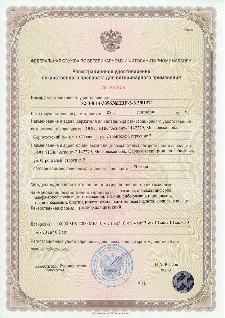 Продукцию от животных после применения элеовита можно использовать без ограничений.