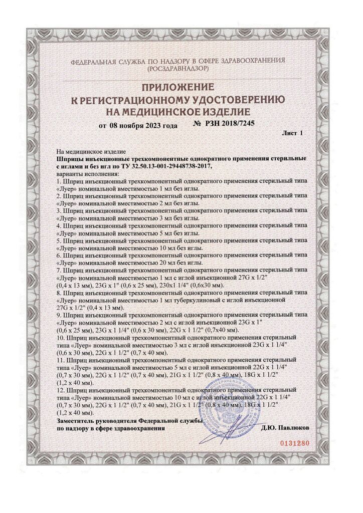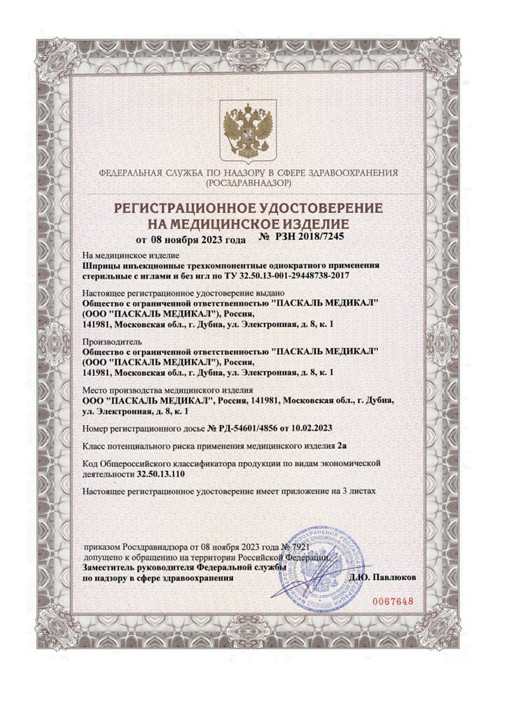 Документы Шприц 3-х компонентный Pascal 20 мл с иглой 21G (0,8х40 мм) 80 шт