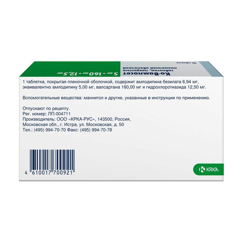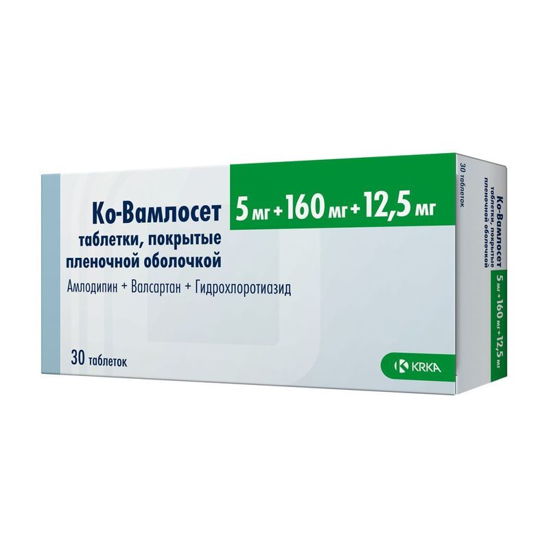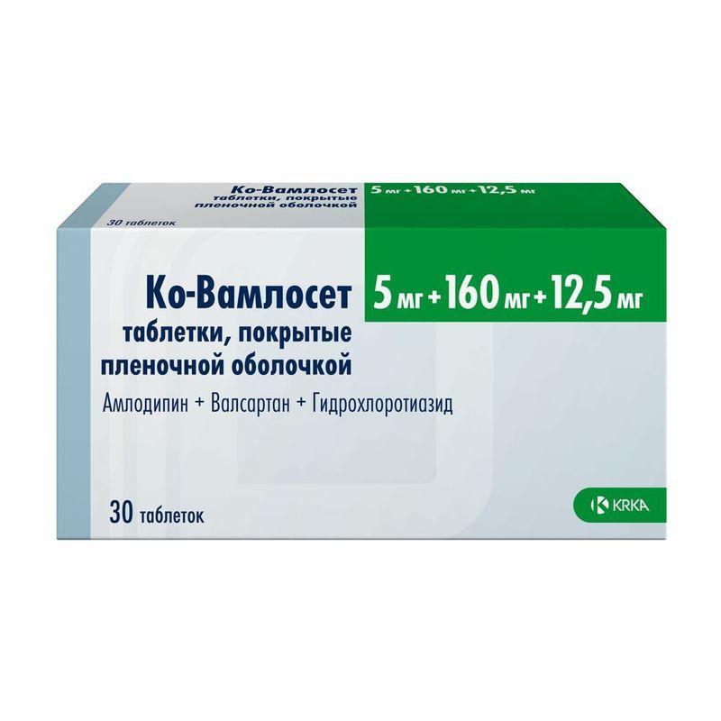 Препарат Ко-Вамлосет является комбинацией трех гипотензивных компонентов с дополняющим друг друга механизмом контроля артериального давления (АД): амлодипина (производное дигидропиридина) –БМКК, валсартана –АРА II и гидрохлоротиазида (ГХТЗ) – тиазидного диуретика. Комбинация этих компонентов приводит к более выраженному снижению АД по сравнению с таковым на фоне монотерапии каждым препаратом в отдельности.
