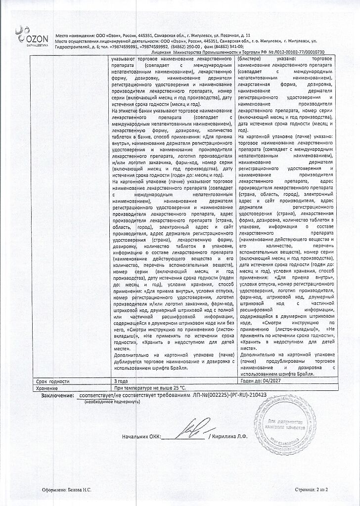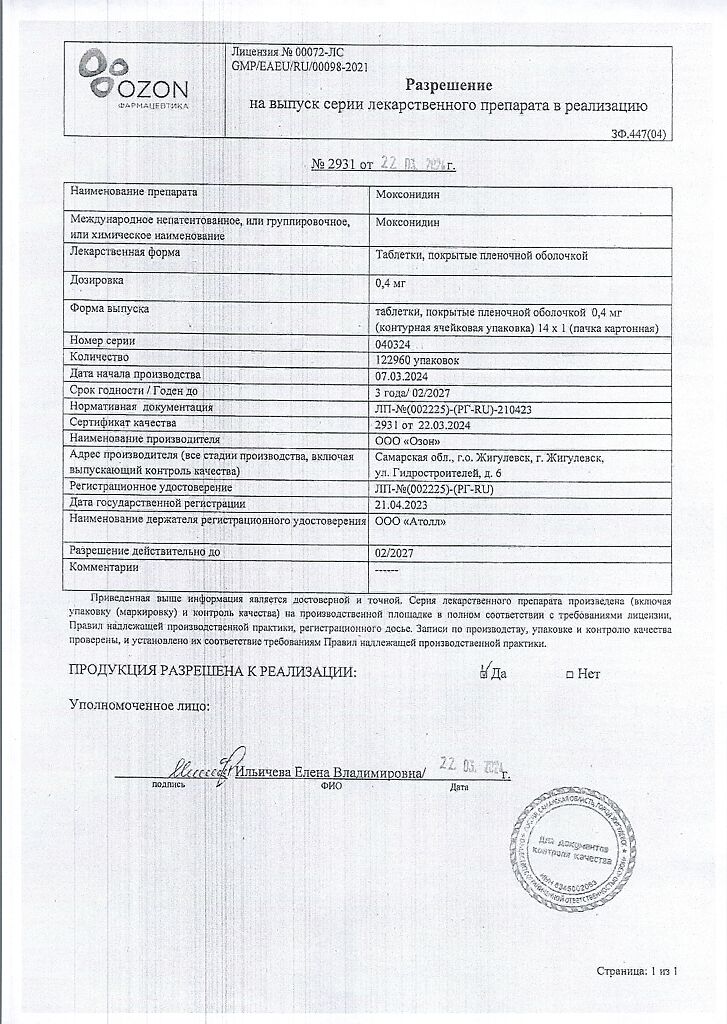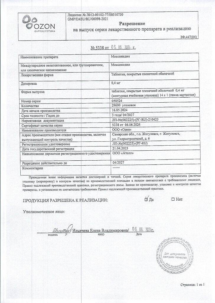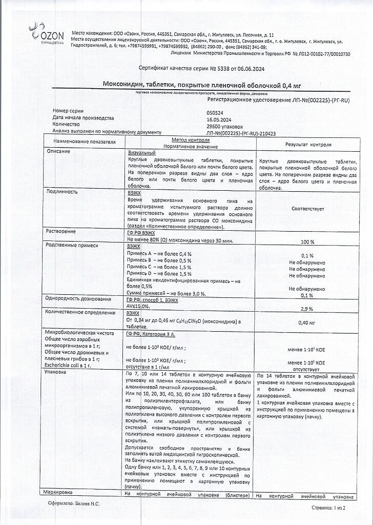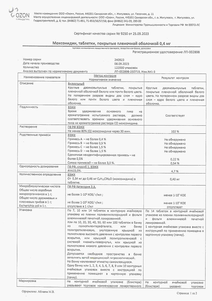 Документы Моксонидин таблетки покрыт.плен.об. 0,4 мг 14 шт