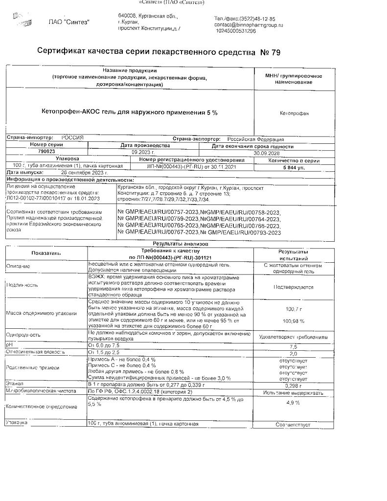 Документы Кетопрофен-АКОС гель для наружного применения 5 % 100 г 1 шт