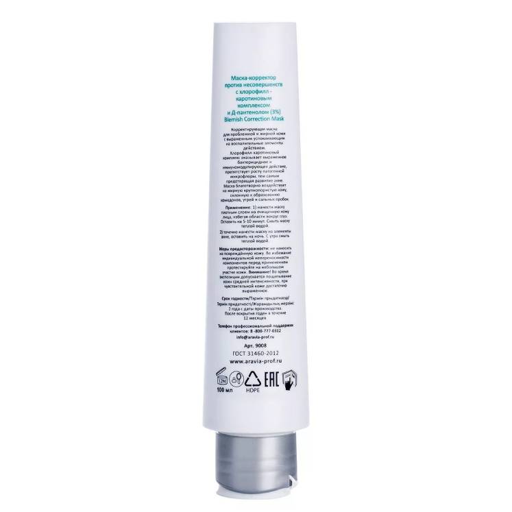 • 📒 Подробная инструкция по применению Aravia Professional Маска-корректор против несовершенств с хлорофилл-каротиновым комплексом и Д-пантенолом (3%) Blemish Correction Mask 100 мл 1 шт