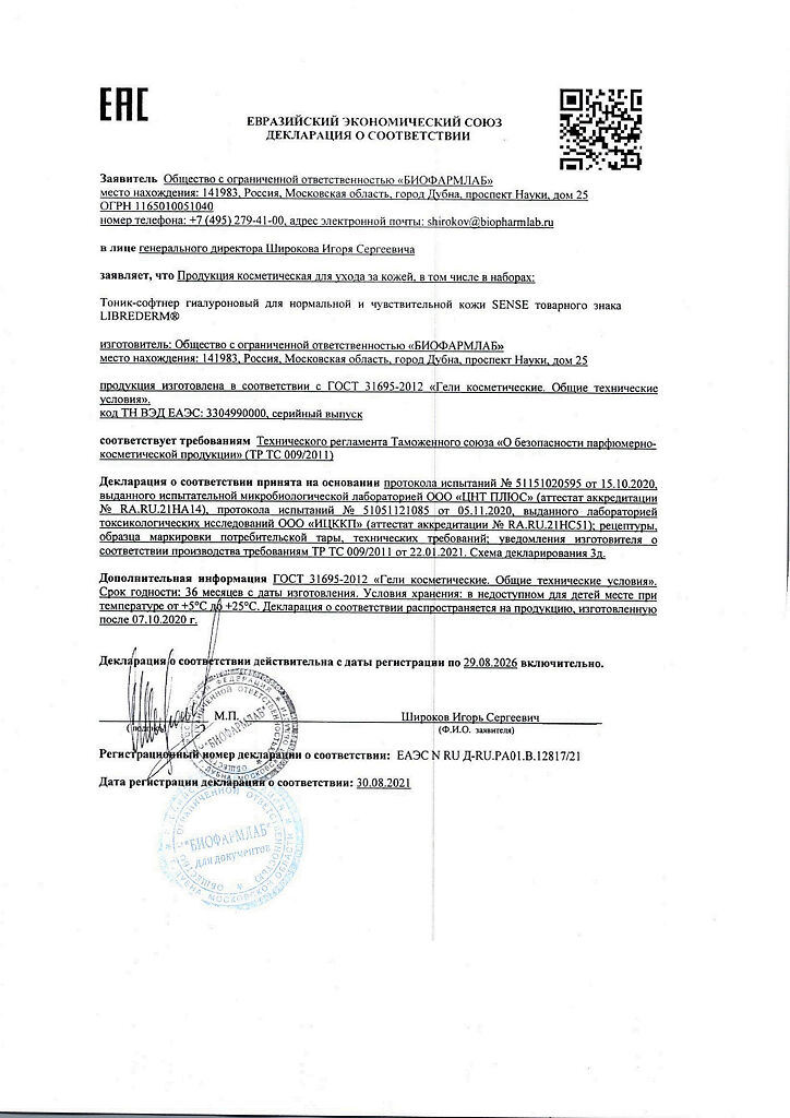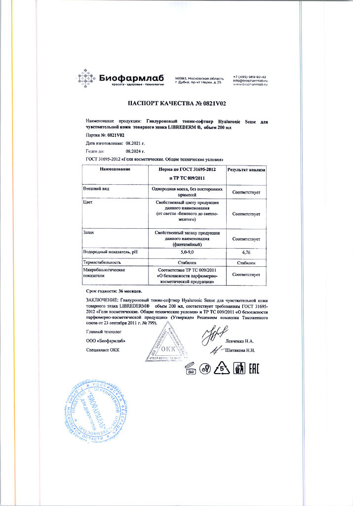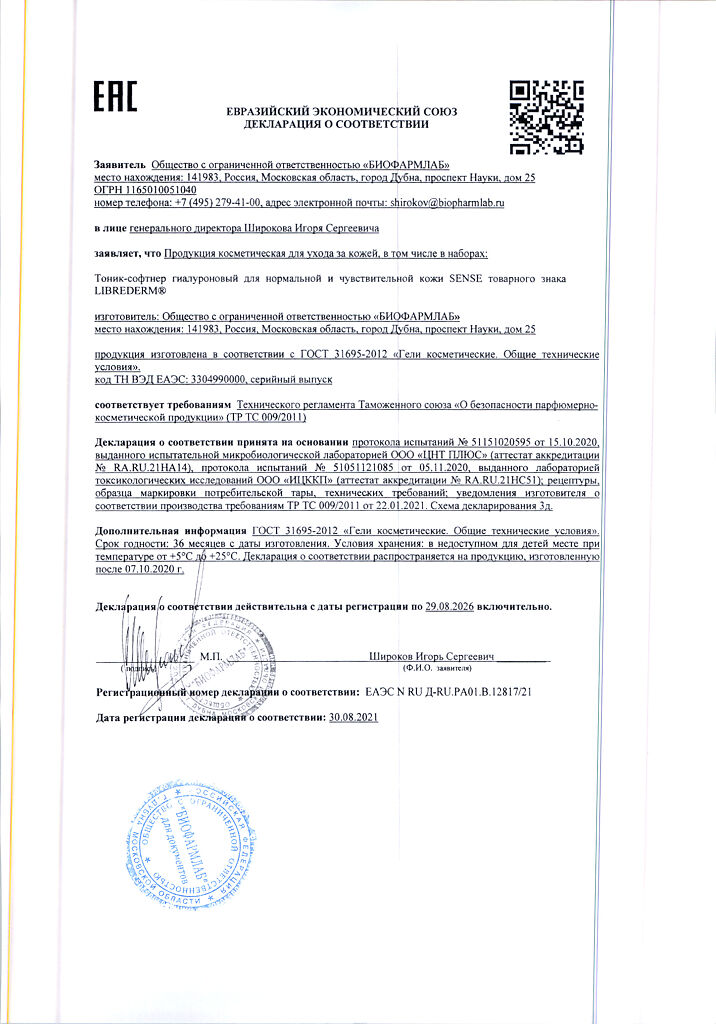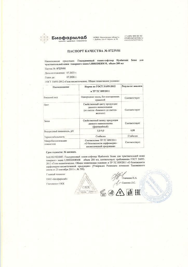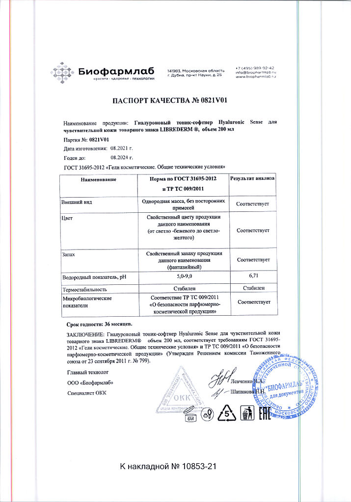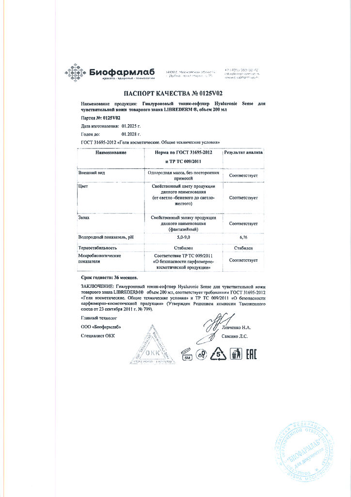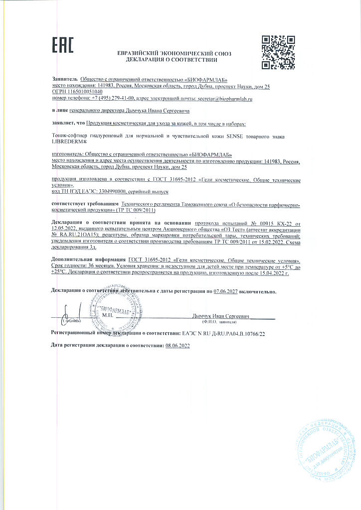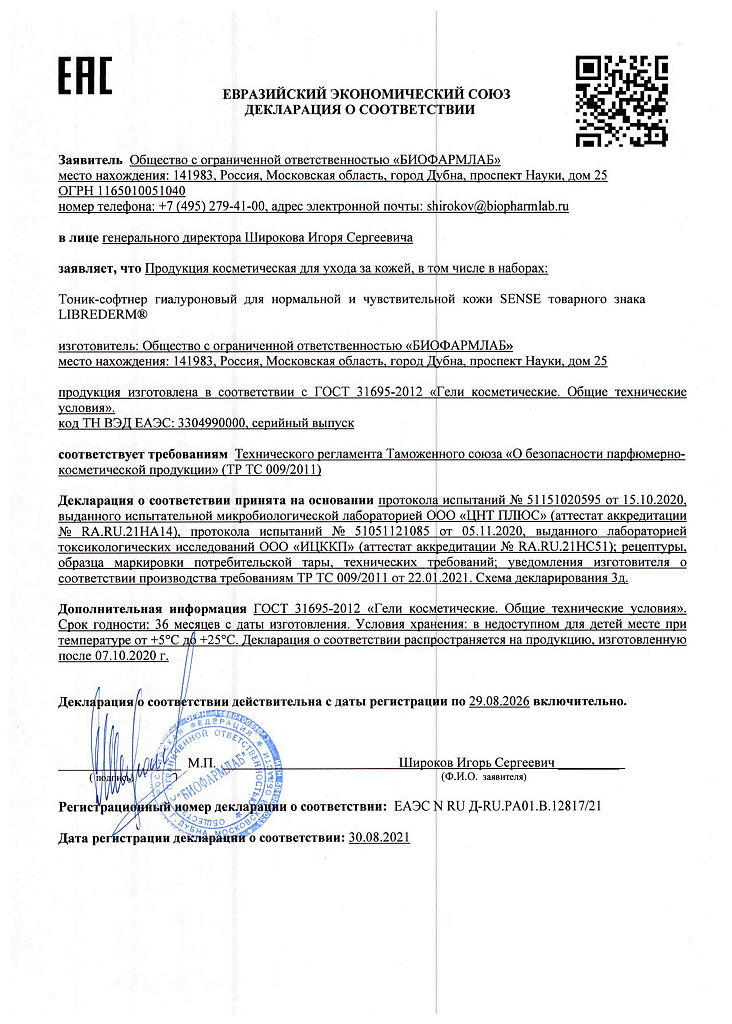 Документы Либридерм (Librederm) Sense Гиалуроновый тоник-софтнер для нормальной и чувствительной кожи 200 мл 1 шт