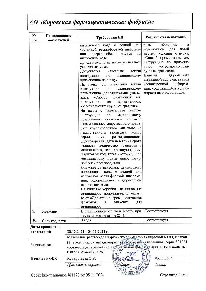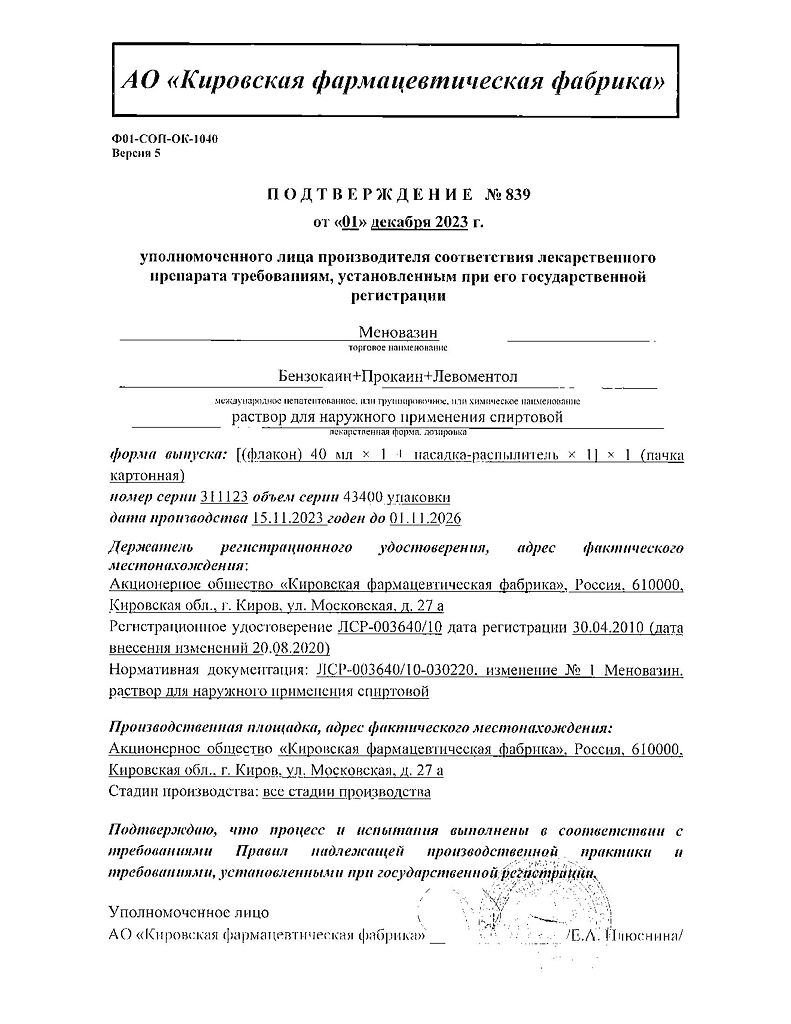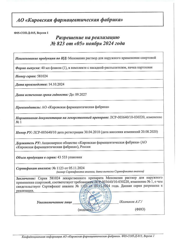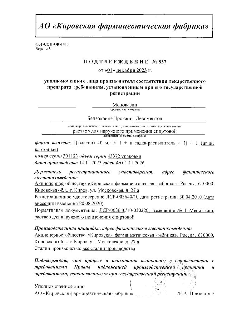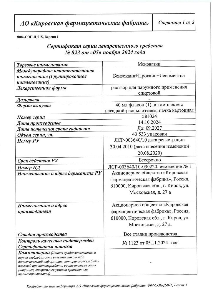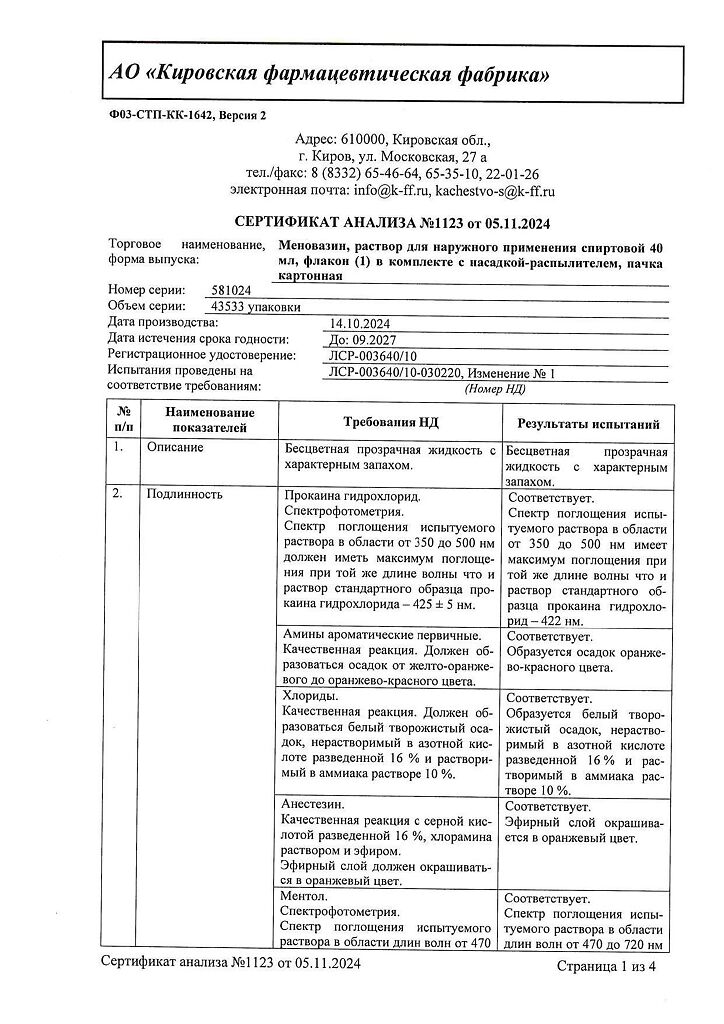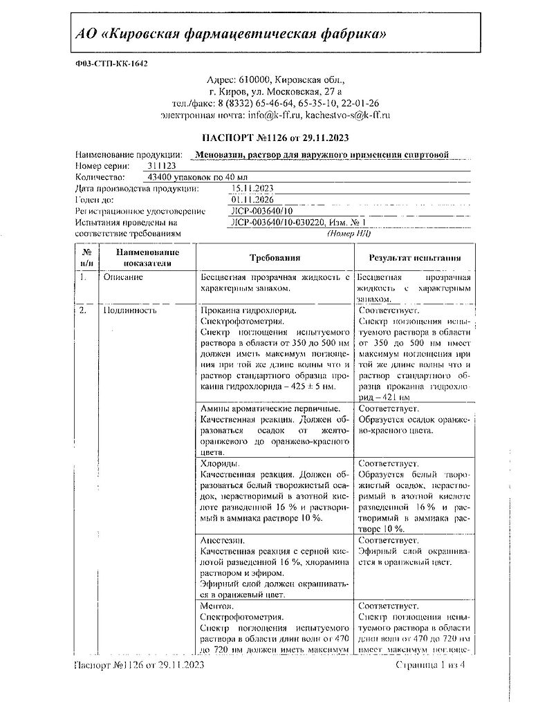 Документы Меновазин раствор для наружного применения спиртовой 40 мл 1 шт