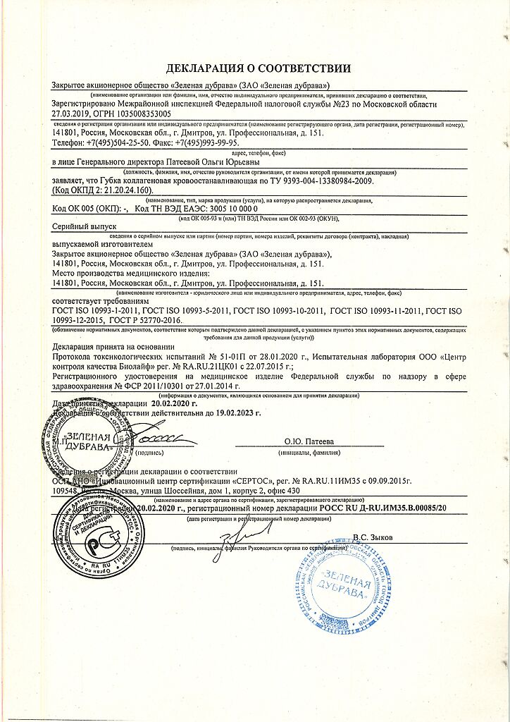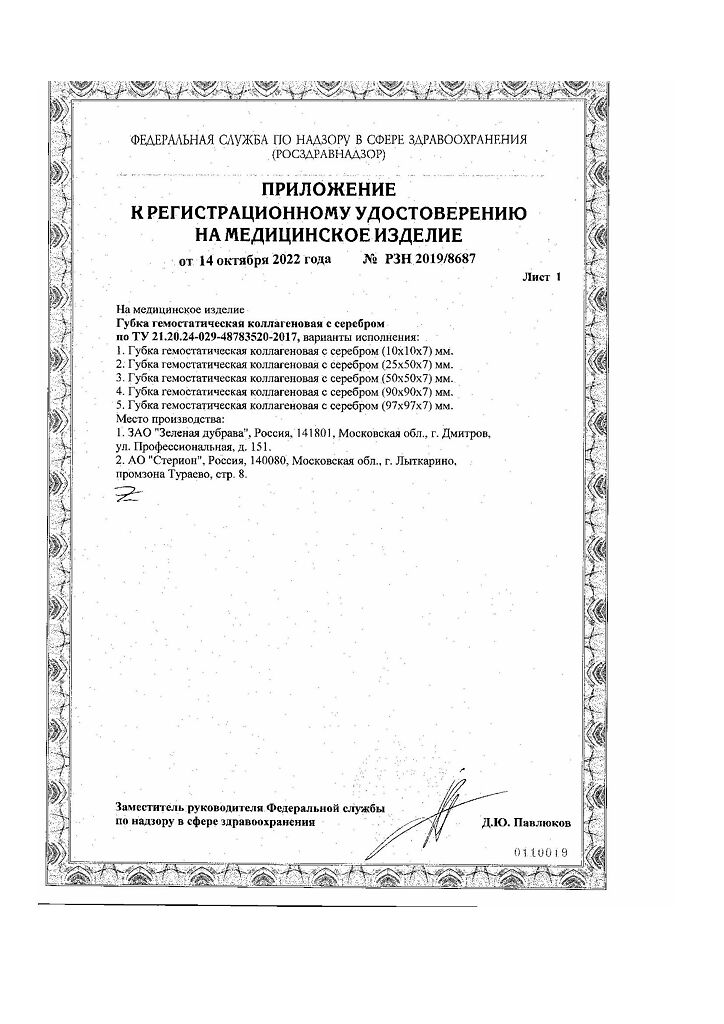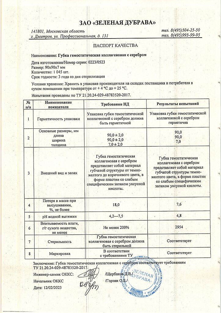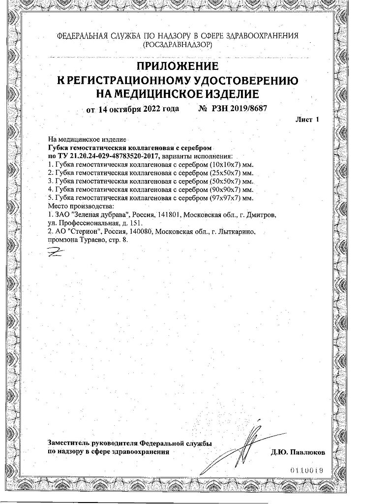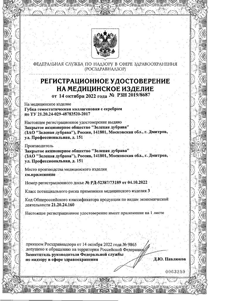 Документы Губка гемостатическая коллагеновая с серебром 90х90х7 мм 1 шт