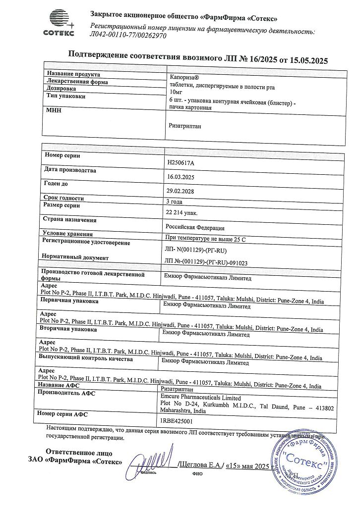 Действующее вещество: Ризатриптан