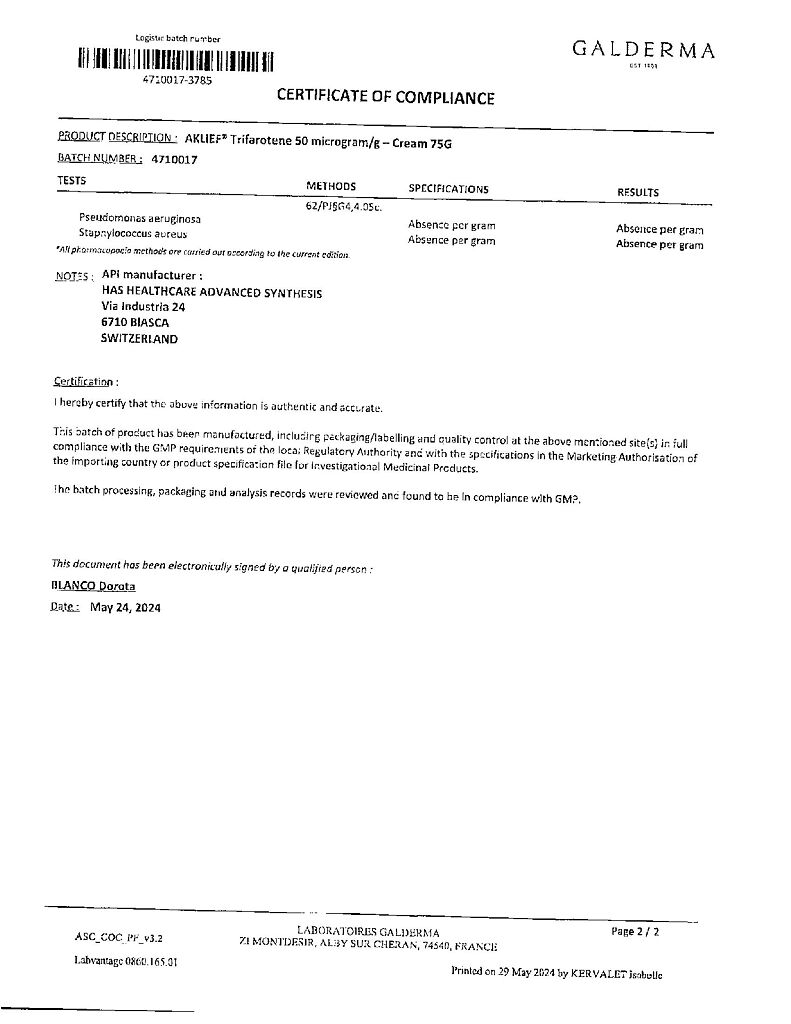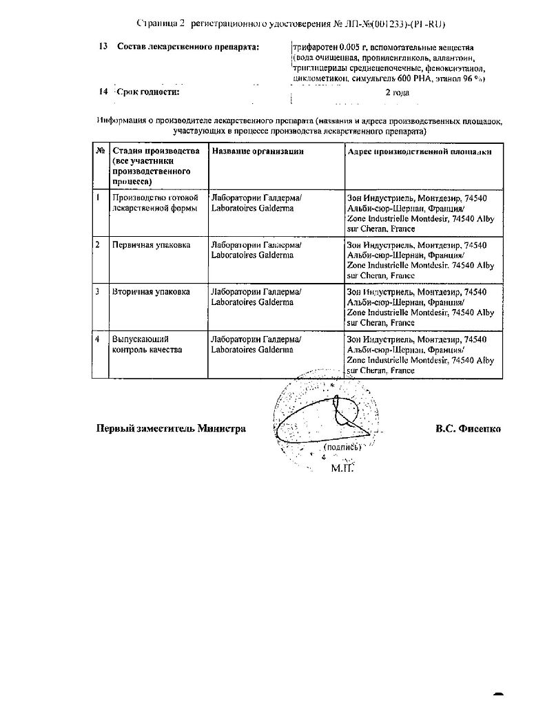 После 4 недель лечения у семи из девятнадцати (37%) взрослых пациентов уровень трифаротена в плазме крови измерили количественно. Cmax составила от уровня ниже предела количественного определения (LOQ < 5 пг/мл) до 10 пг/мл, и AUC0-24ч составила от 75 до 104 пг.час/мл.