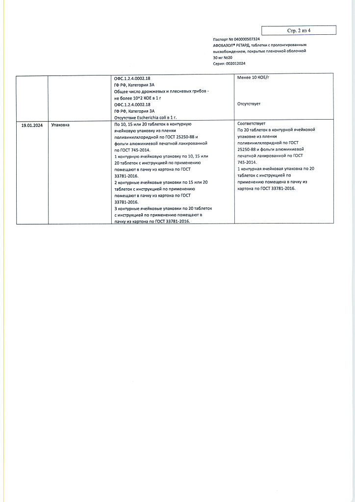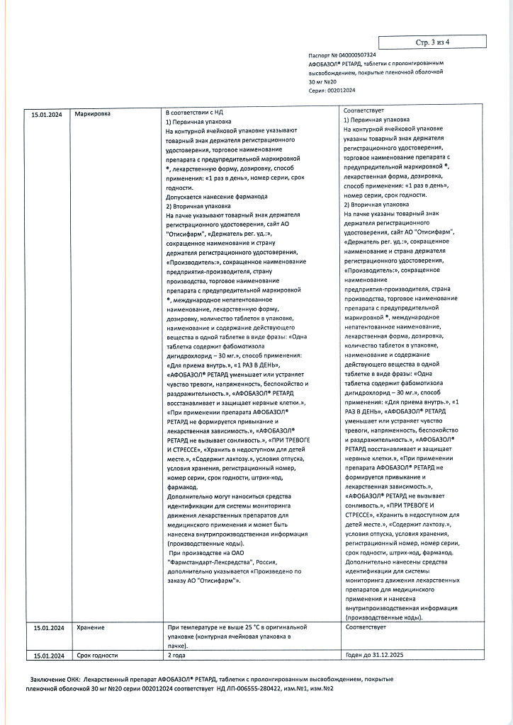 Документы Афобазол Ретард таблетки с пролонг высвобождением покрыт.плен.об. 30 мг 20 шт