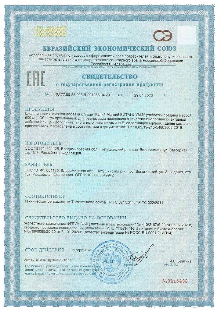 Документы Витаниум Калий Магний таблетки массой 500 мг 50 шт