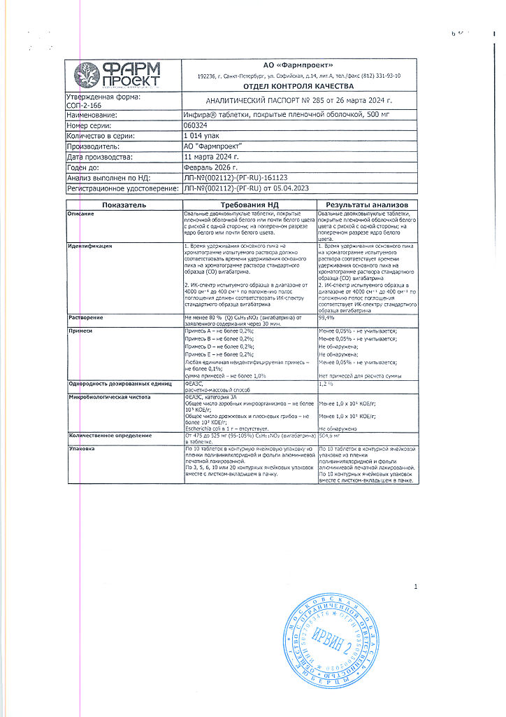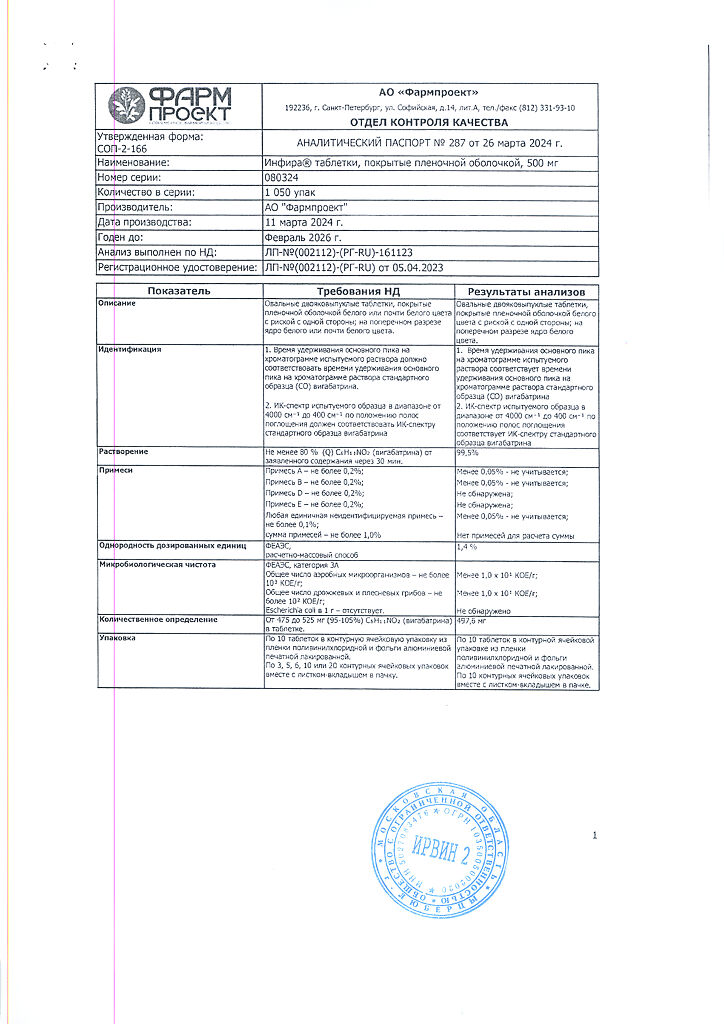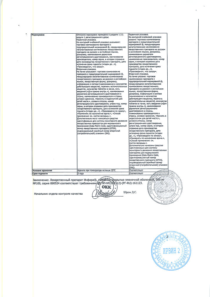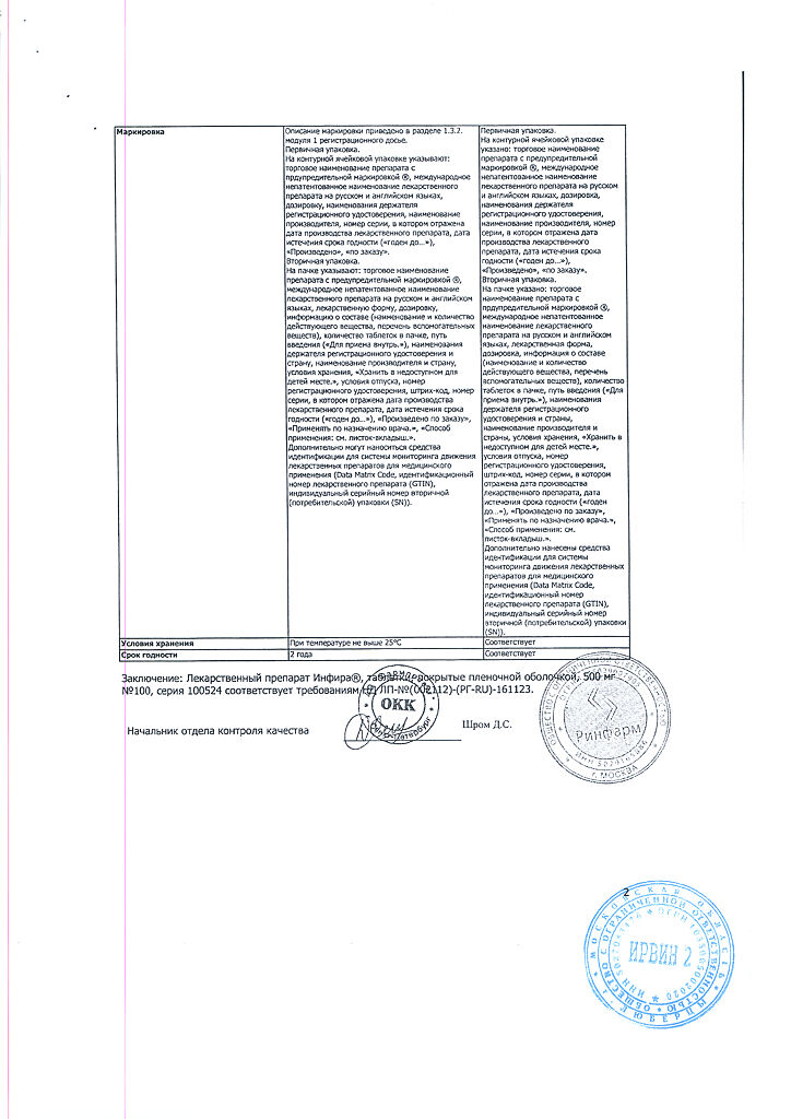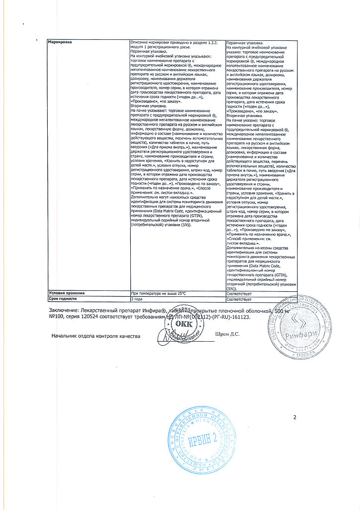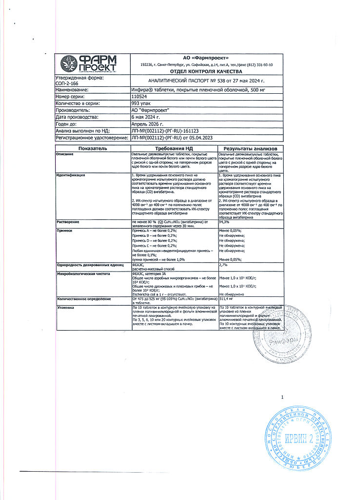 Документы Инфира таблетки покрыт.плен.об. 500 мг 100 шт
