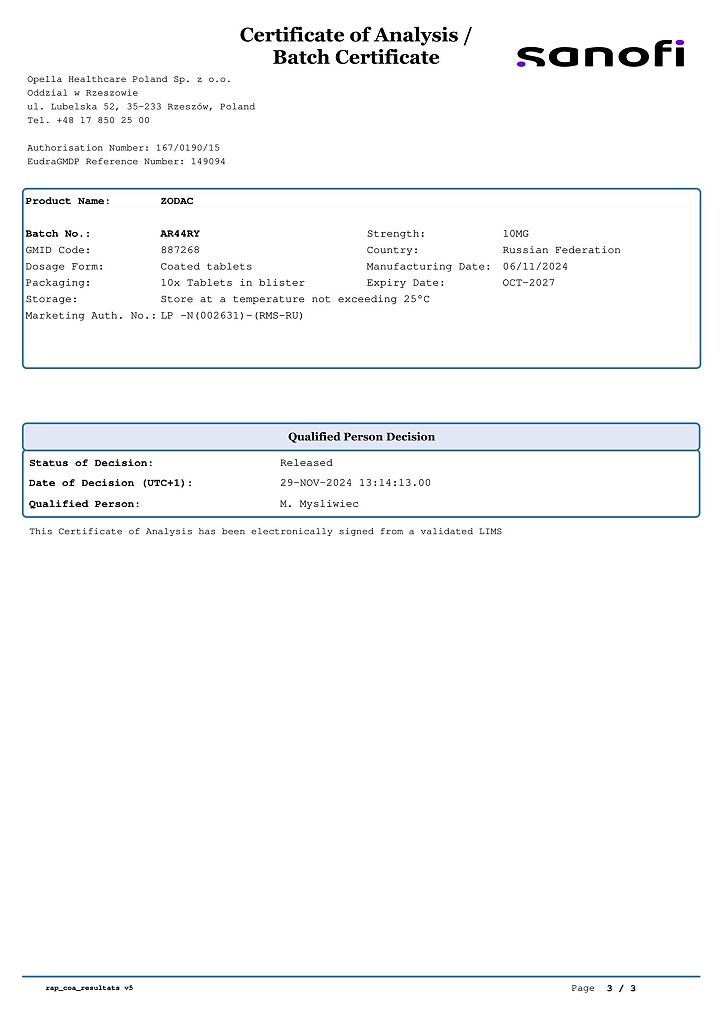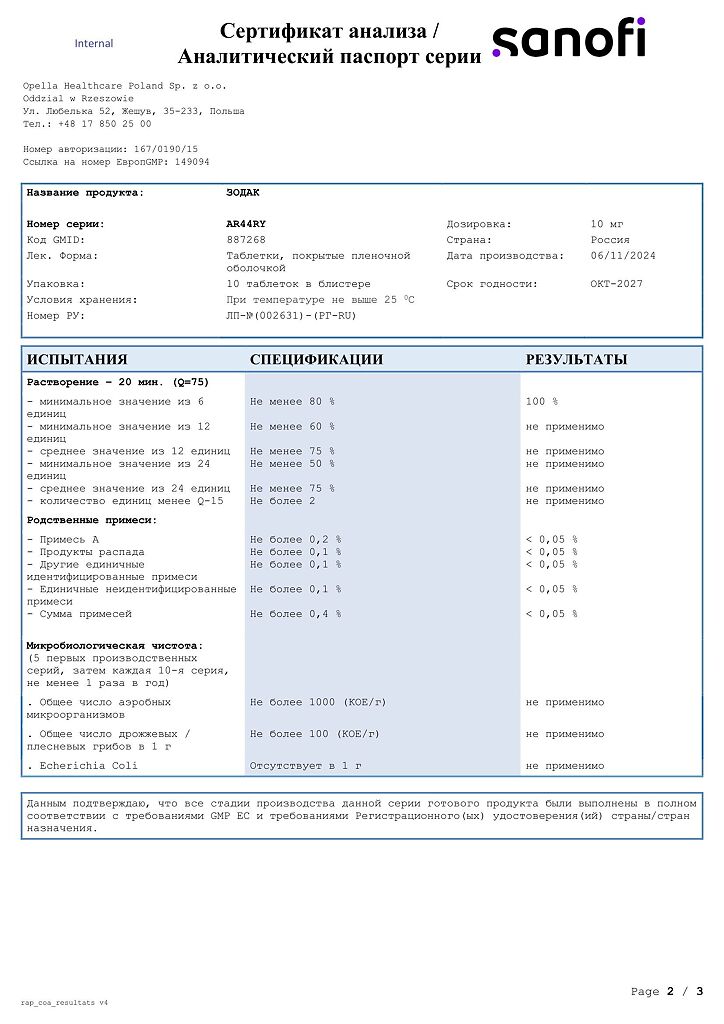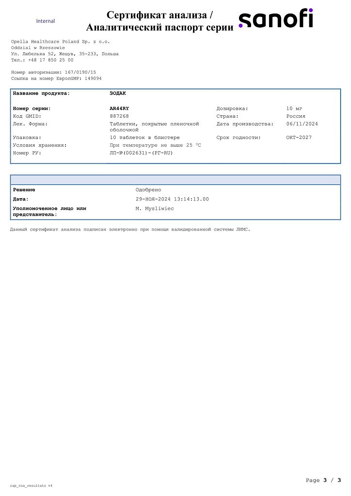 Документы Зодак таблетки покрыт.плен.об. 10 мг 10 шт