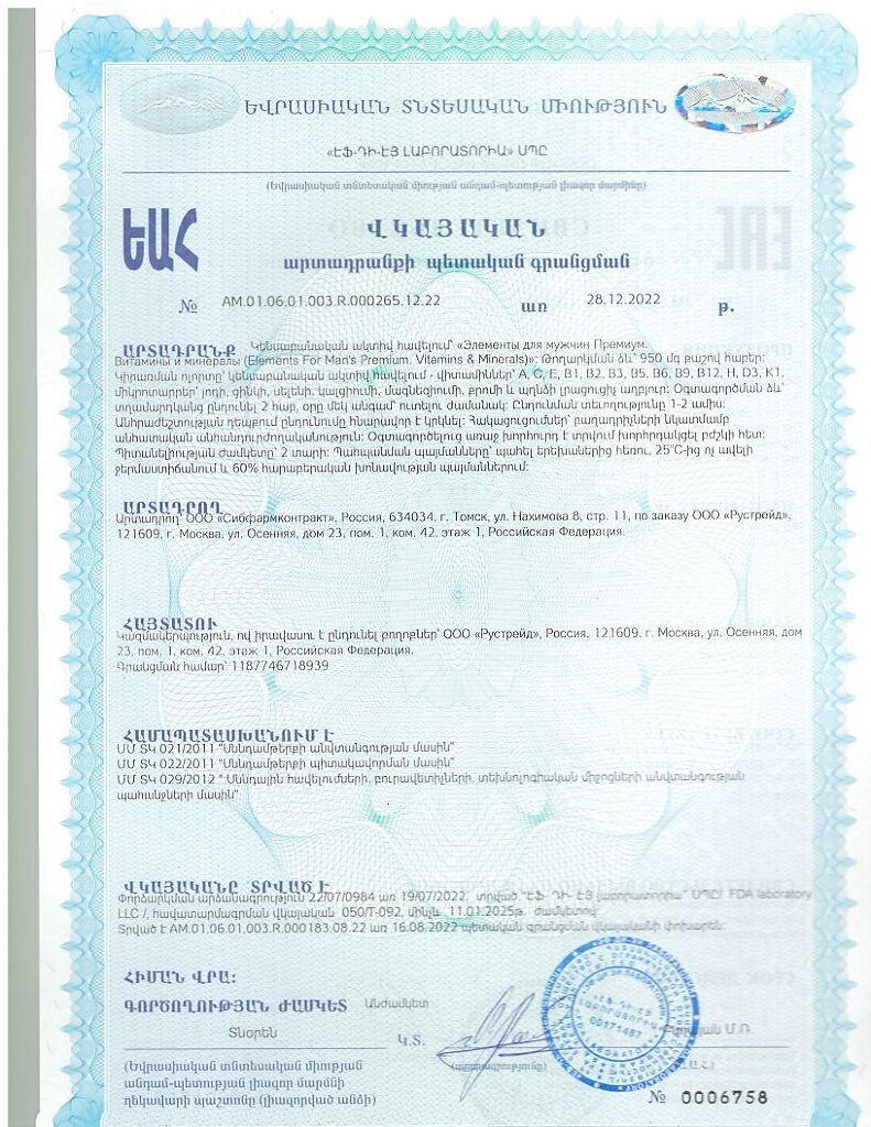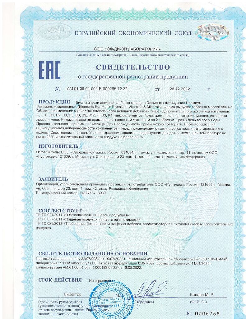 Документы Элементы для мужчин Премиум Витамины и минералы / Elements for Men Premium Vitamins & Minerals UltraBalance таблетки массой 950 мг 180 шт