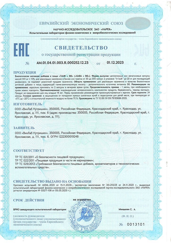 Документы 1WIN ГАМК + B6 / GABA + B6 капсулы массой 510 мг 60 шт