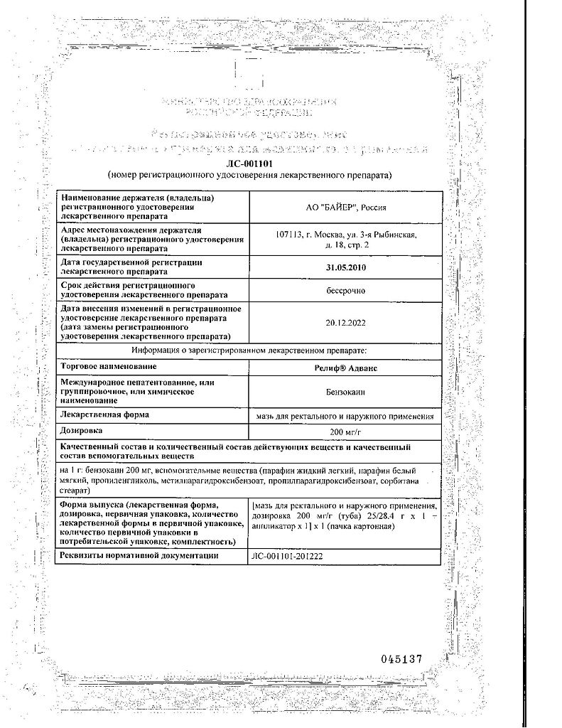 Документы Релиф Адванс мазь для ректального и наружного применения 200 мг/г 25 г 1 шт
