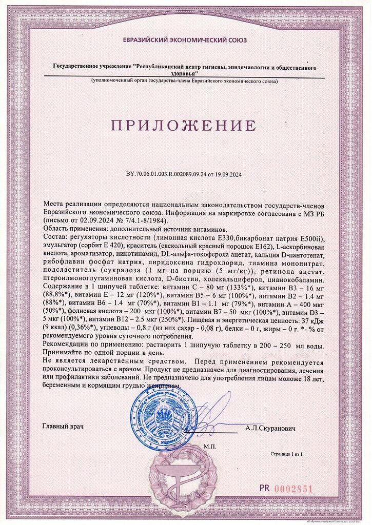 Состав: кислота (лимонная кислота), регулятор кислотности (бикарбонат натрия), наполняющий агент (сорбит*), свекольный порошок, L-аскорбиновая кислота, ароматизатор, подсластитель (сукралоза), никотинамид, DL-альфа-токоферола ацетат, кальция D-пантотенат, рибофлавин натрия фосфат, пиридоксина гидрохлорид, тиамина мононитрат, ретинола ацетат, птероилмоноглутаминовая кислота, D-биотин, холекальциферол, цианокобаламин.
