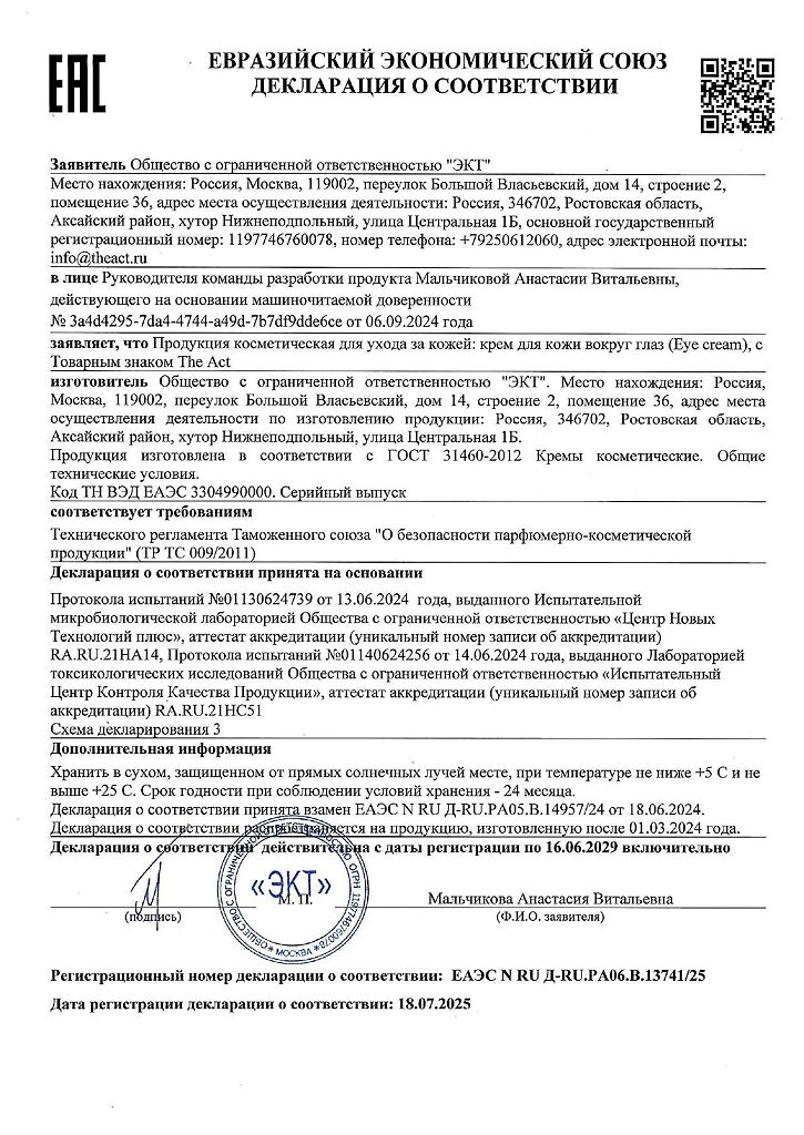 Документы The Act Укрепляющий крем для кожи вокруг глаз со светоотражающими частицами 20 мл 1 шт