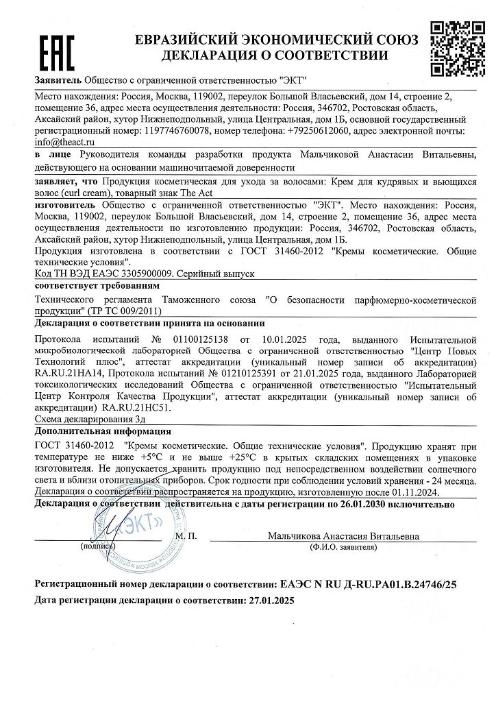 Документы The Act Крем для кудрявых и вьющихся волос Style 200 мл 1 шт