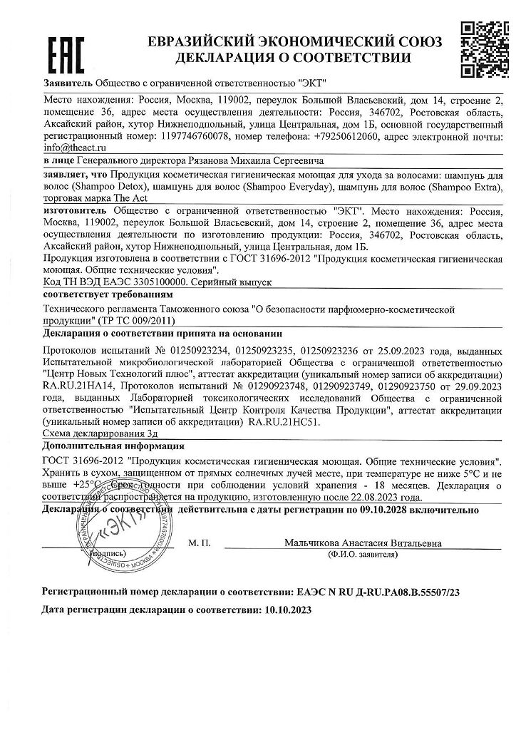 Документы The Act Глубоко очищающий шампунь Detox с яблочным уксусом и гидролизованным кератином 280 мл 1 шт