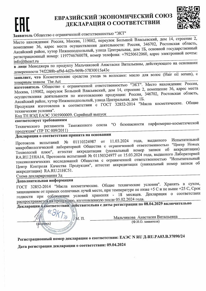 Документы The Act Восстанавливающее масло для волос Extra 50 мл 1 шт