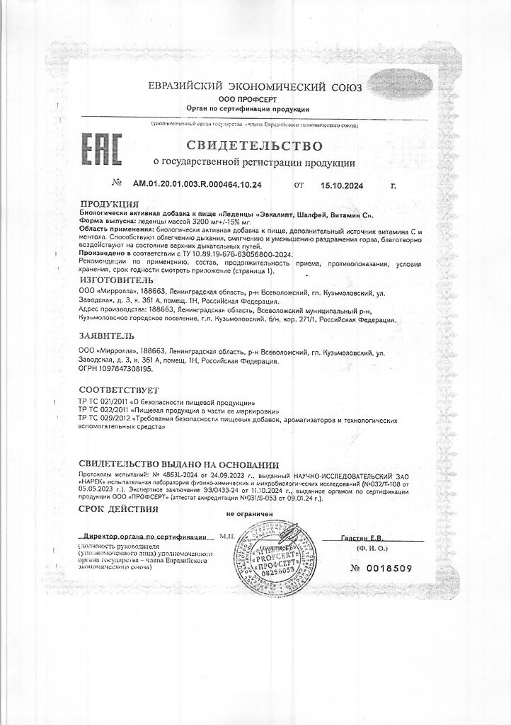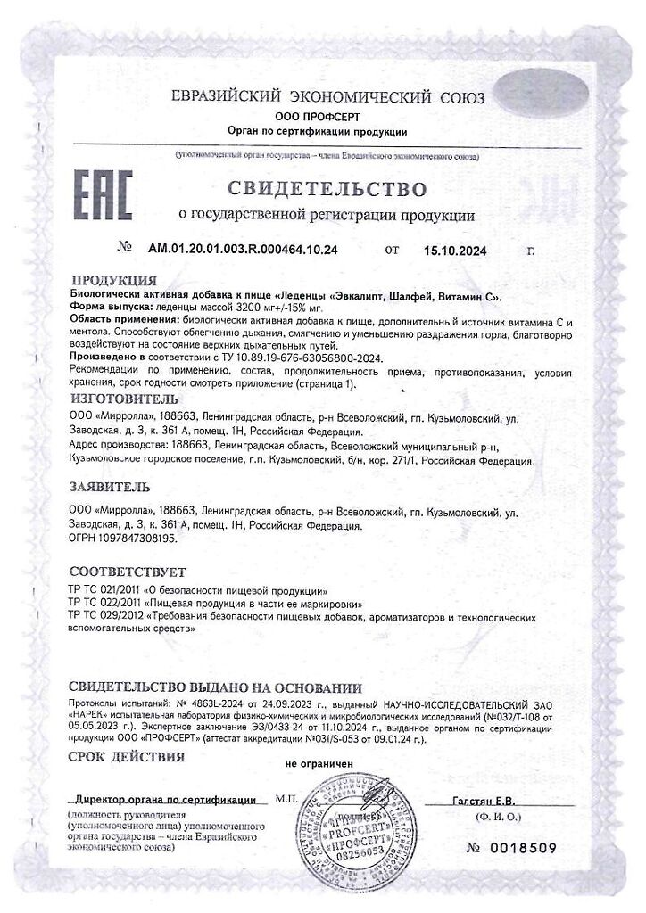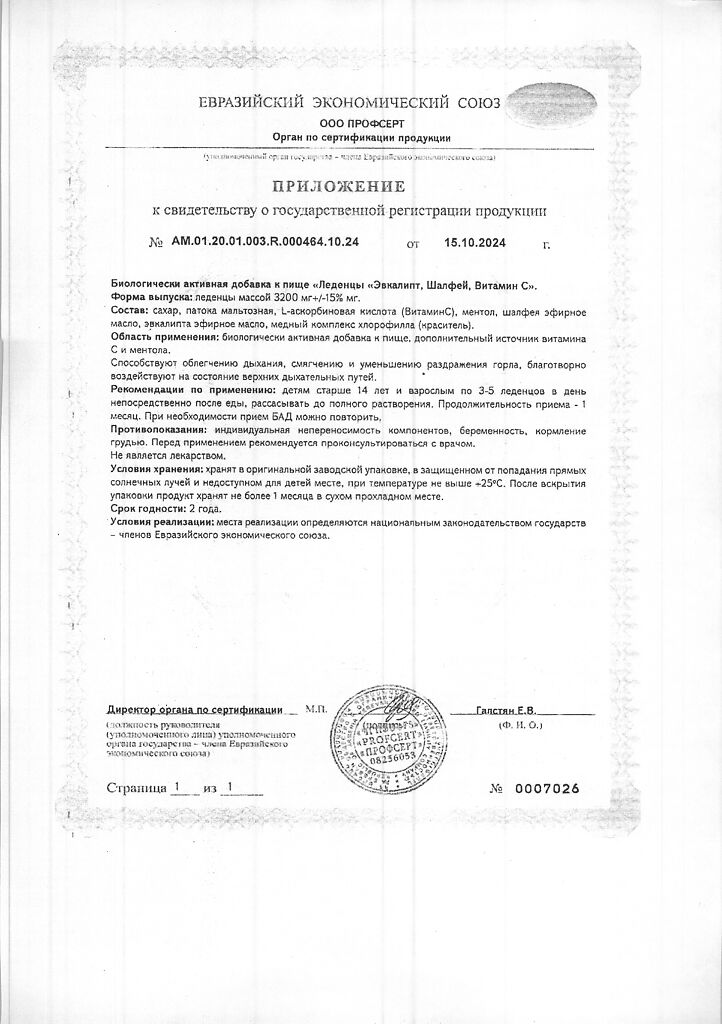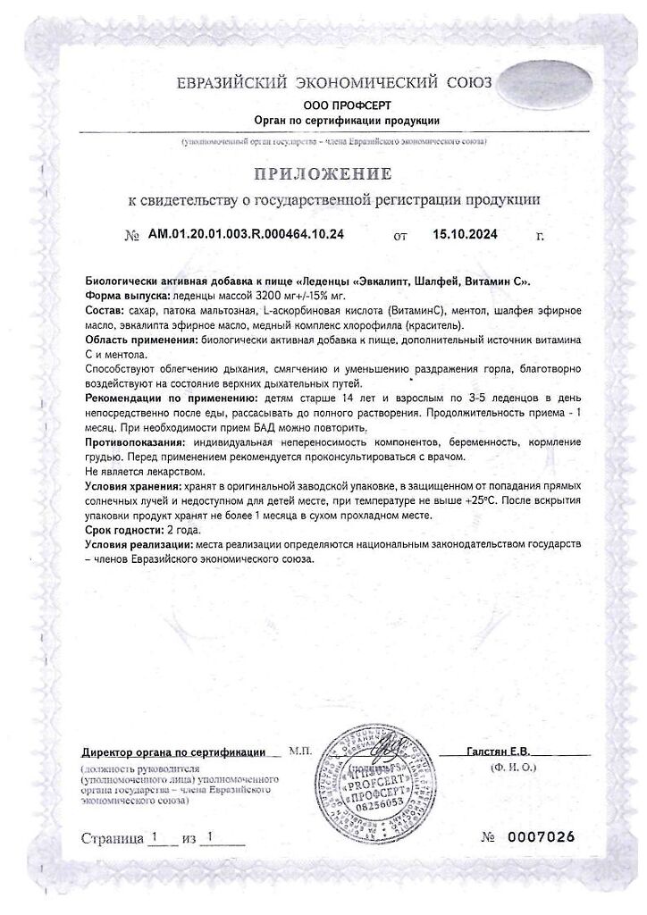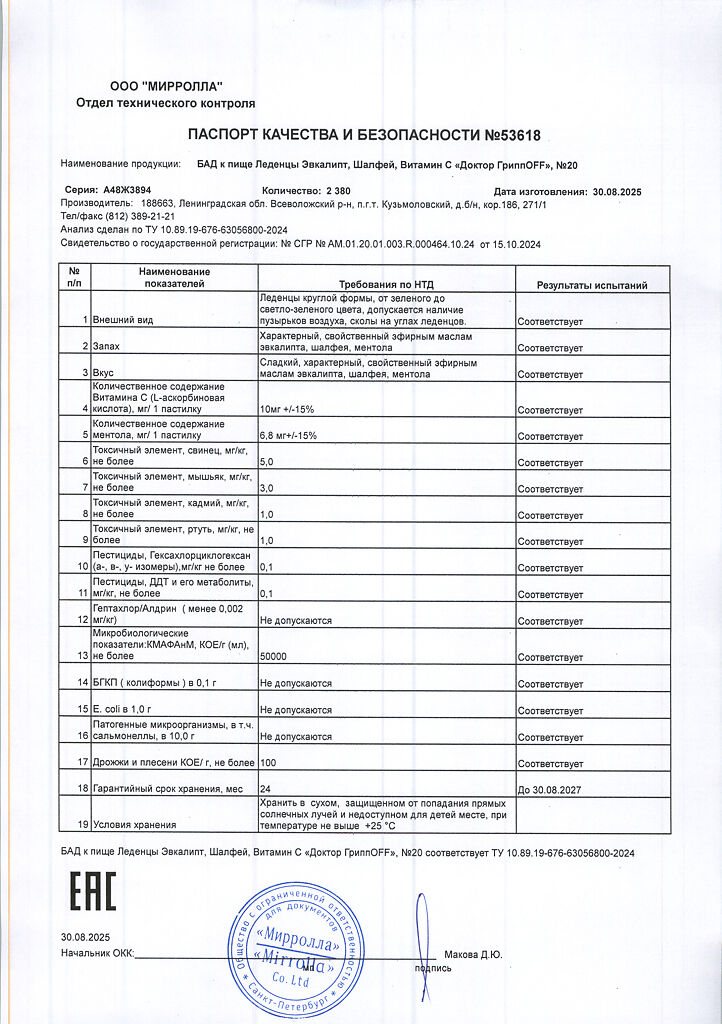 Документы Доктор ГриппOFF Эвкалипт, Шалфей, Витамин С леденцы массой 3200 мг 20 шт